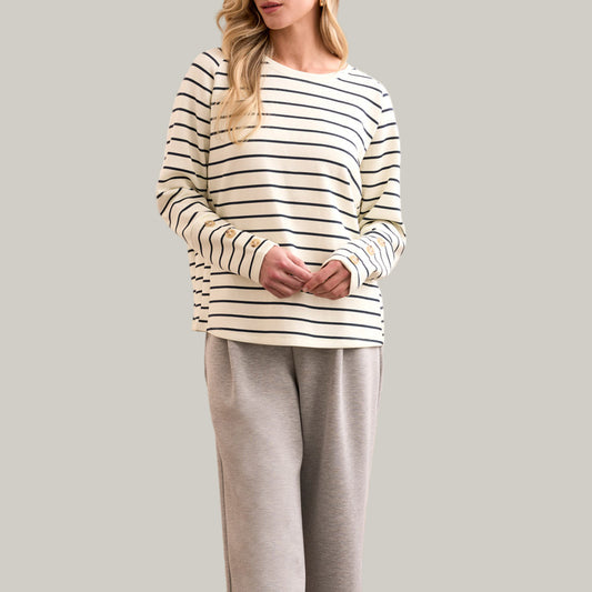 Tribal - Stripe Scuba Knit Button-Sleeve Crew Neck Top