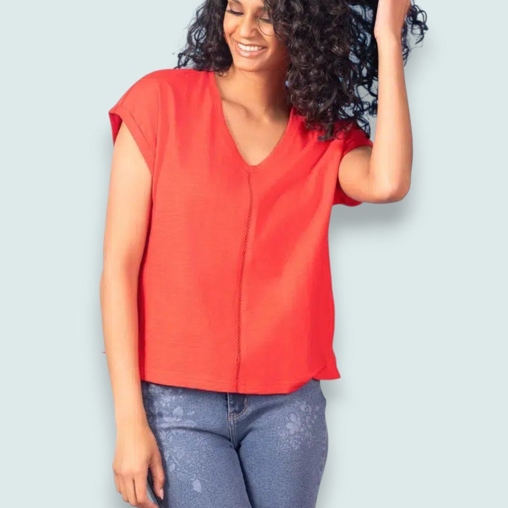 Effortlessly chic and wonderfully wearable, the Alison Sheri Seam Detail V-Neck Top brings understated sophistication to your everyday rotation. The signature vertical seam detail creates a subtle lengthening effect, while soft cap sleeves and a relaxed drape deliver comfort without compromise. This fluid top strikes that perfect balance between polished and laid-back—dress it up with tailored trousers or keep it casual with your favorite denim. Material is 100% cotton.