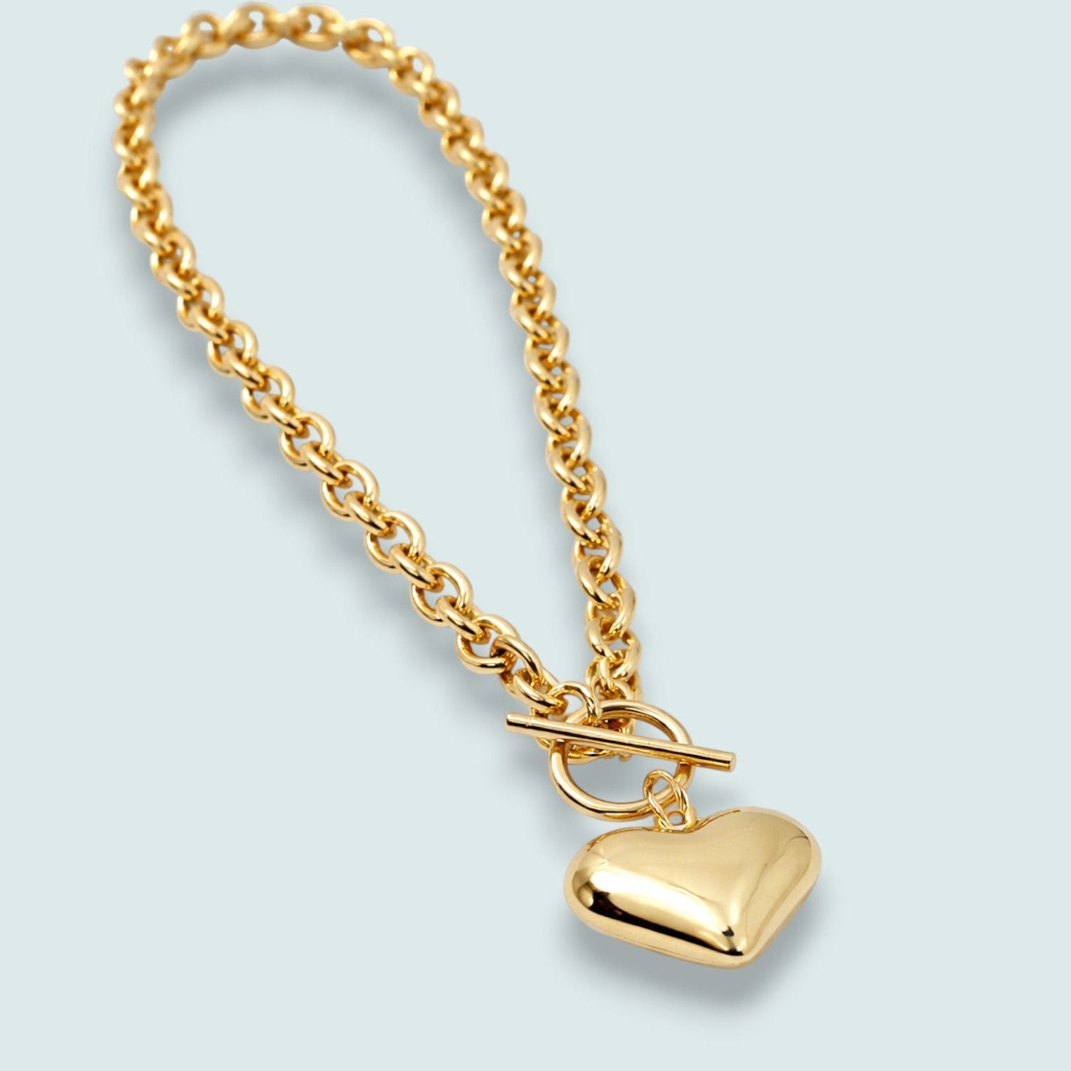 Bold yet beautifully refined, the Modern Romance Heart Toggle Necklace is your go-to statement piece for effortless elegance. This chunky polished link chain pairs perfectly with a smooth puff heart charm, blending contemporary edge with timeless romance in the most delightful way. The front toggle closure isn't just functional—it's a stylish, fashion-forward detail that makes getting dressed feel like a breeze. High-shine finishing gives the heart a soft, mirror-like glow that catches light and compliments beautifully. Choose between luminous gold or sleek silver to match your vibe. Layer it with your favorite pieces or let it shine solo—either way, it's the modern classic every jewelry lover needs in their collection.