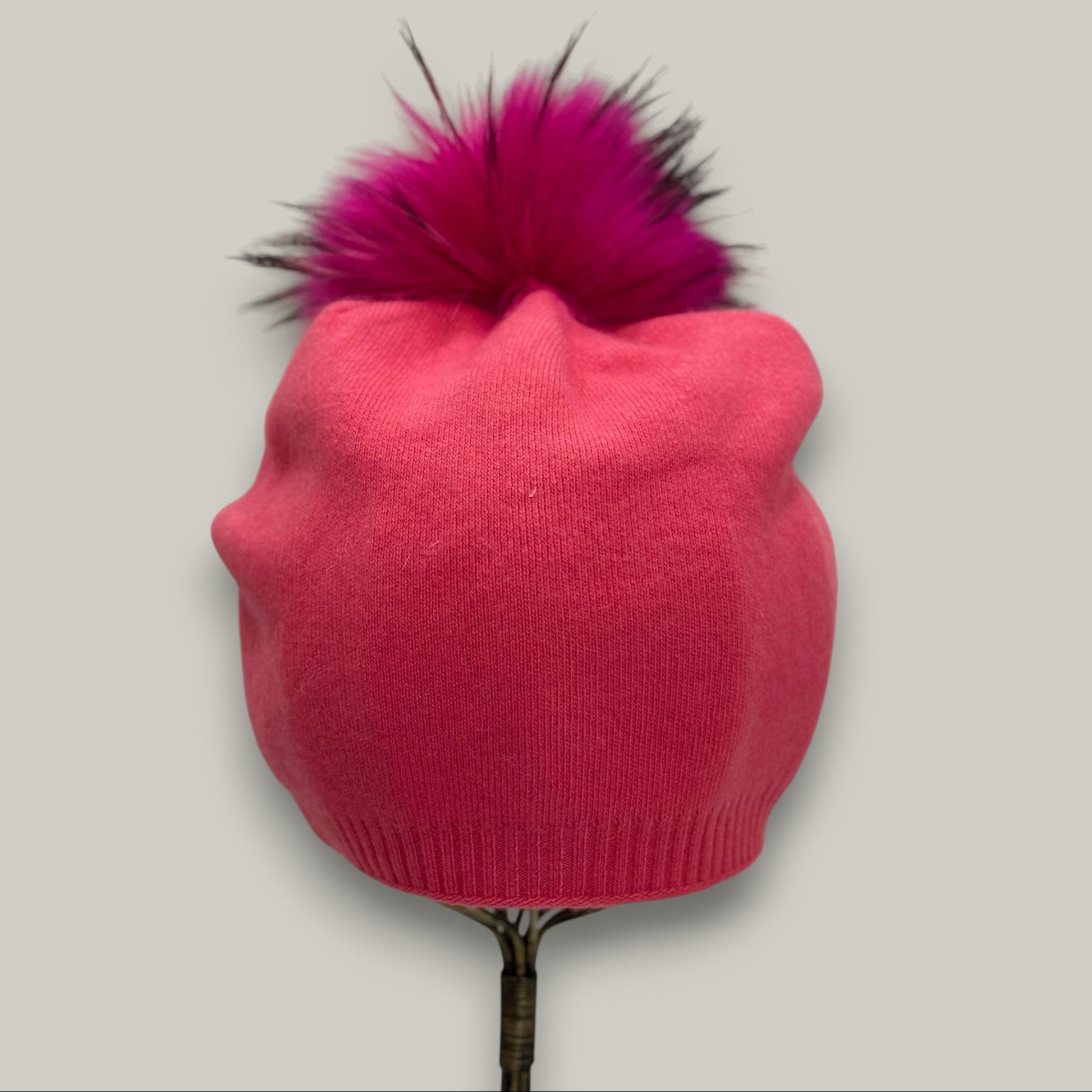 This lively pink beanie brightens up chilly days with its bold fuchsia faux fur pom-pom, complete with eye-catching black tips. The pom-pom is removable, letting you switch up your style easily. Perfect for adding a fun splash of color and cozy warmth to your winter wardrobe. Material is 48% cashmere, 15% nylon, 25% viscose, 12% spandex.
