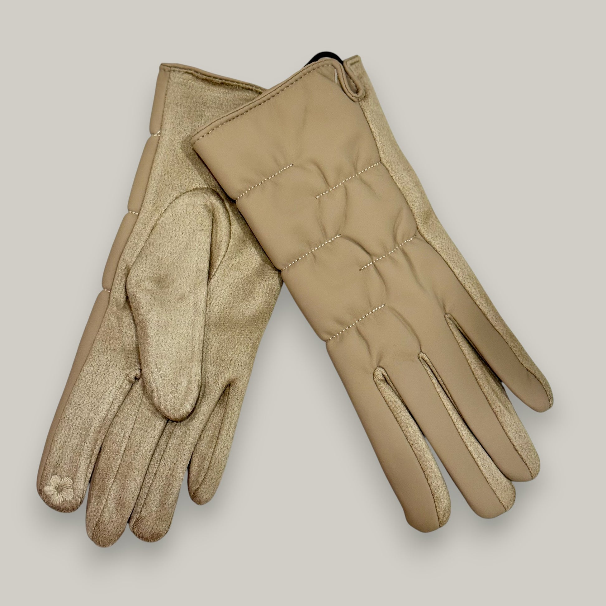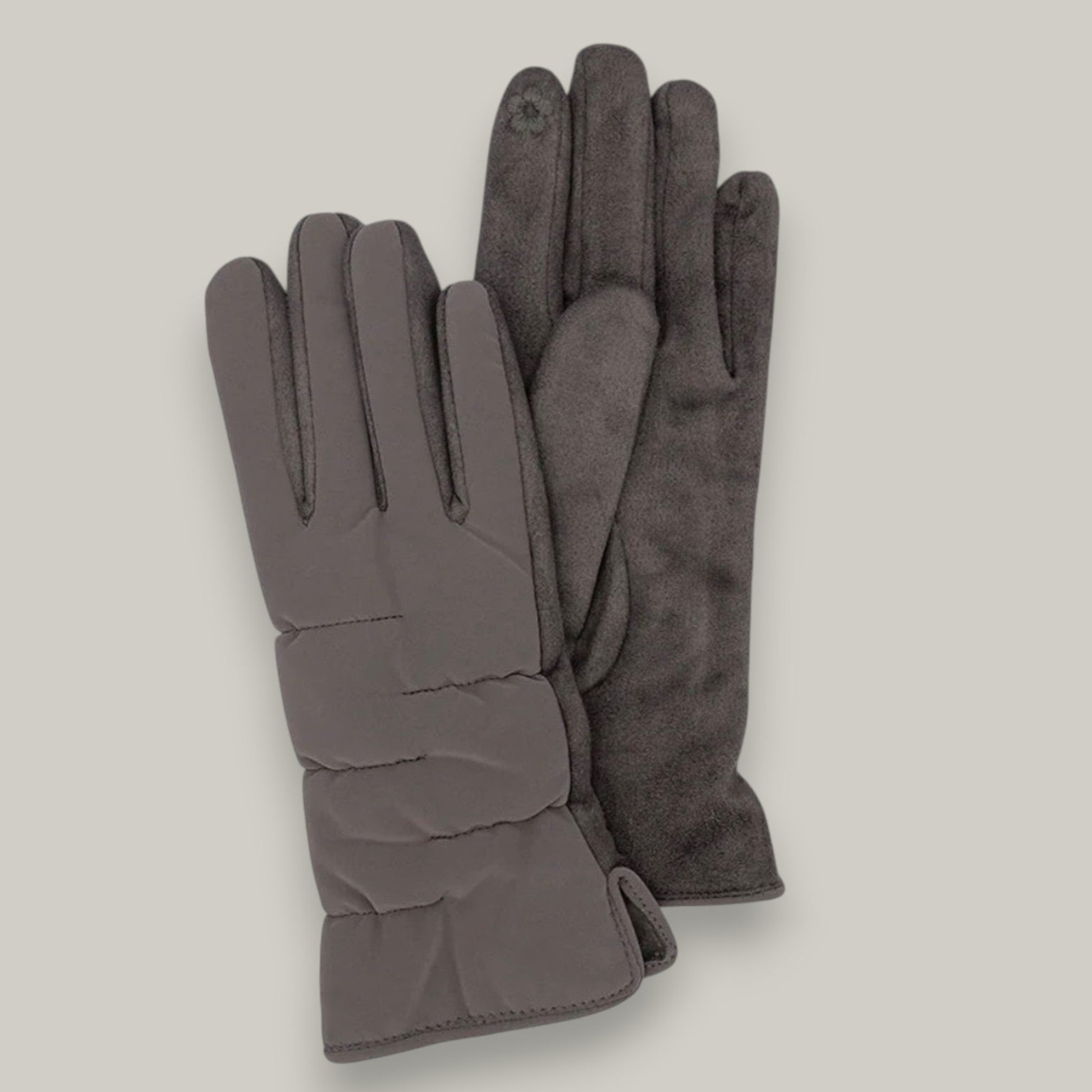 Wrap your hands in warmth and style with Audrey's Quilted Comfort Gloves! Their soft quilted tops pair perfectly with faux suede palms, giving you cozy comfort and a grippy hold. These sleek gloves are your go-to winter sidekicks, effortlessly combining function and flair for all your chilly adventures. Material is 95% polyester, 5% spandex.