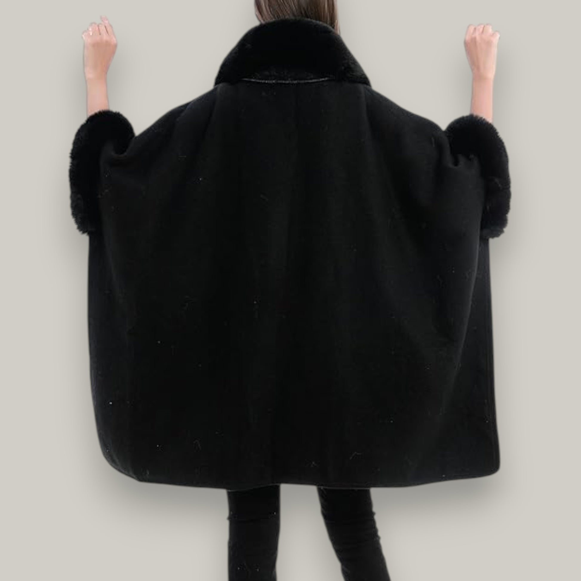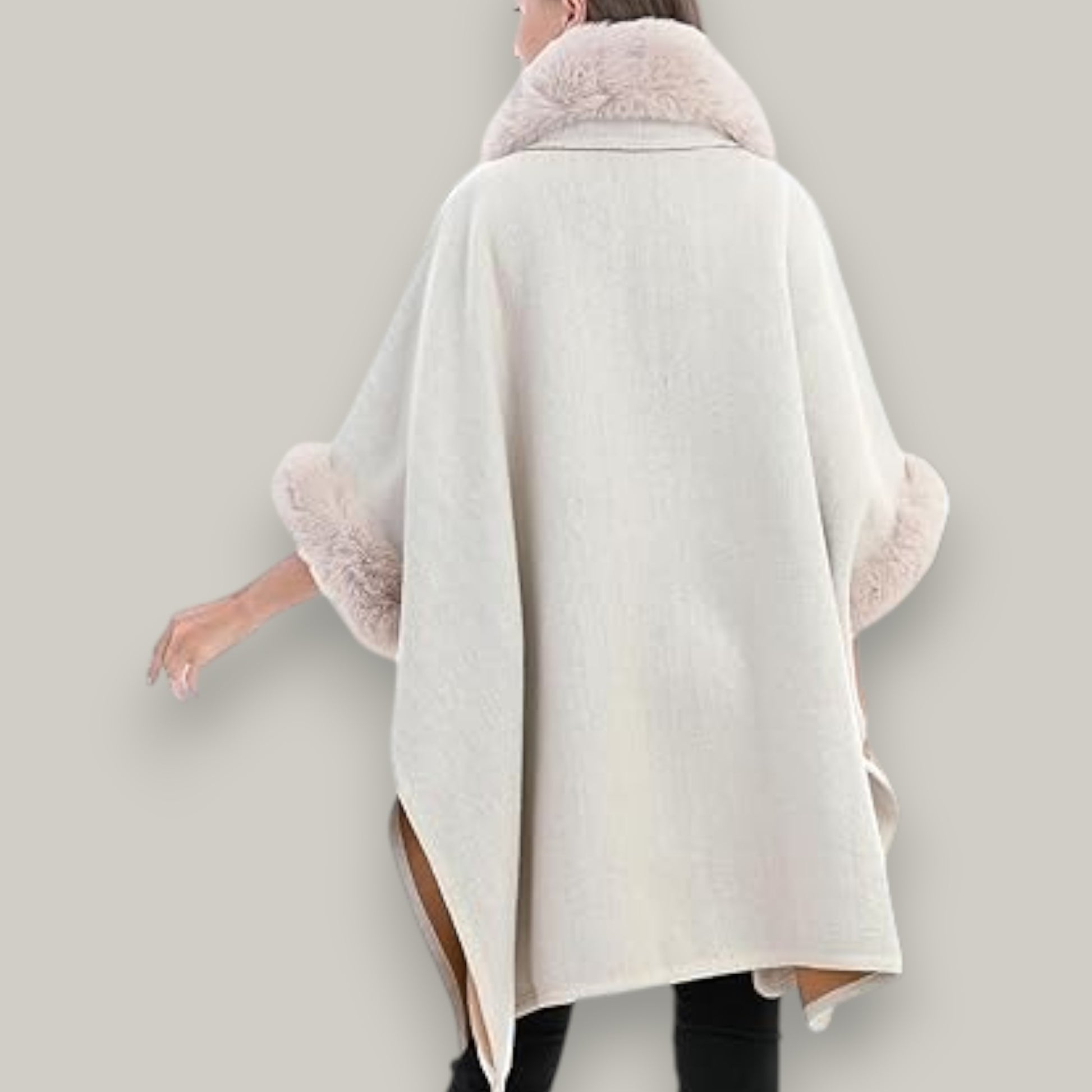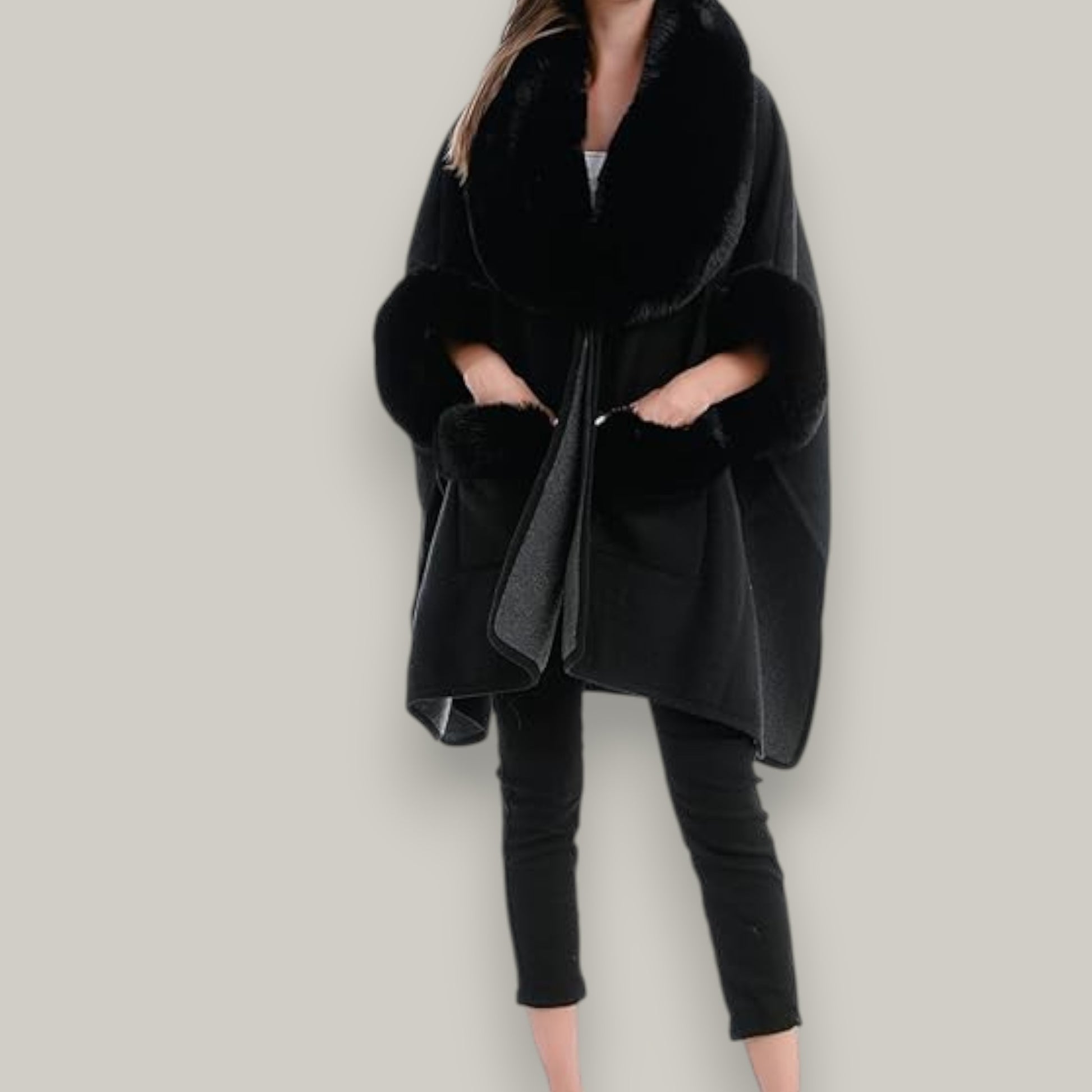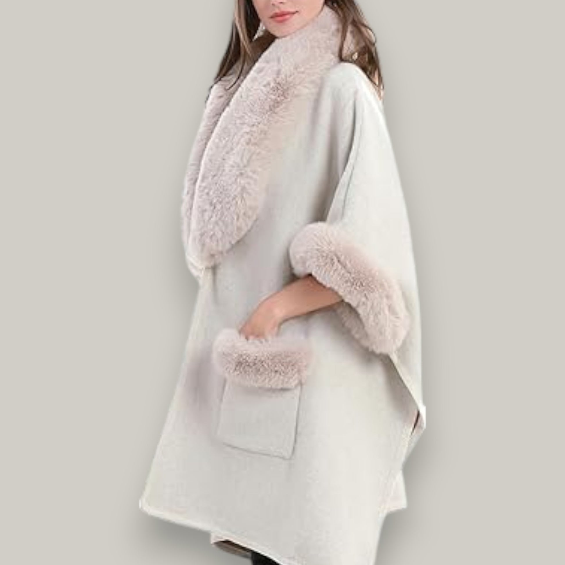 Wrap yourself in cozy elegance with the Belle Dame Faux Fur Poncho Cape. Its soft, draped design offers warmth and style in one, featuring a plush faux fur shawl collar and cuffs that feel like a gentle hug. The open front with a hidden hook-and-eye closure keeps it secure, while two furry-trimmed pockets add playful charm and handy storage. Perfect for chic winter days when you want to stay warm and turn heads effortlessly. Material is 50% acrylic, 50% polyester.