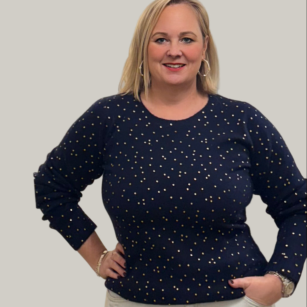 Elevate your everyday with the Carreli Sparkle Knit Sweater—a deep-navy essential that catches the light just right. Delicate metallic studs scattered across the knit create an understated shimmer, perfect for adding a hint of glamour without the fuss. Cozy, versatile, and undeniably chic, this sweater transitions seamlessly from casual days to nights out. Material is 5% wool, 70% acrylic, 22% nylon, 3% spandex.