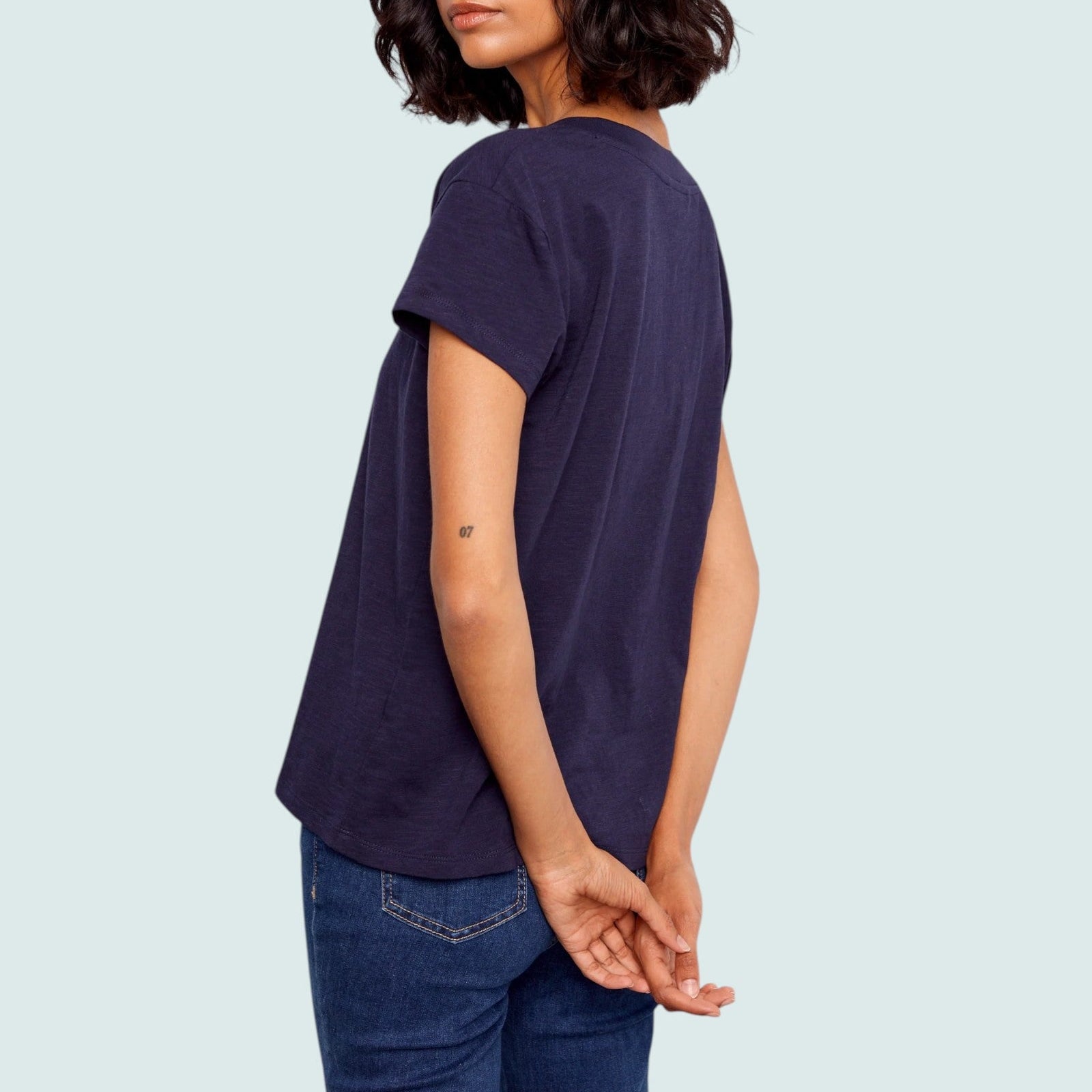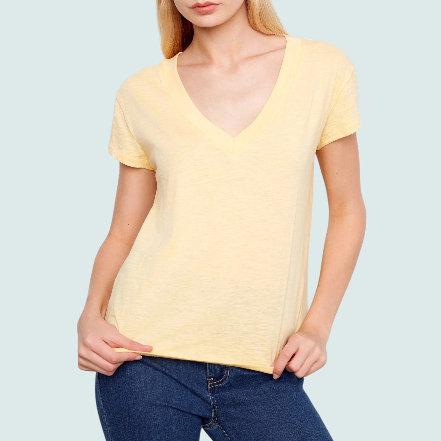 Designed for understated elegance, this Charlie B tee features a relaxed drop shoulder and flattering V-neck in organic cotton. The lightweight fabric drapes beautifully, making it an ideal layering piece or standalone essential for warm-weather styling. Choose from sunshine yellow, crisp white, or classic navy to match your personal aesthetic. A versatile foundation for any season. Material is 100% organic cotton.