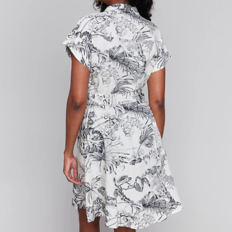 Introducing Charlie B - the ultimate fusion of comfort and style! This short sleeve collar dress features a button front and a belt for a figure-flattering silhouette. Elevate your wardrobe with this versatile dress, guaranteed to make you feel confident and chic for any occasion. Material is 55% linen, 45% viscose.