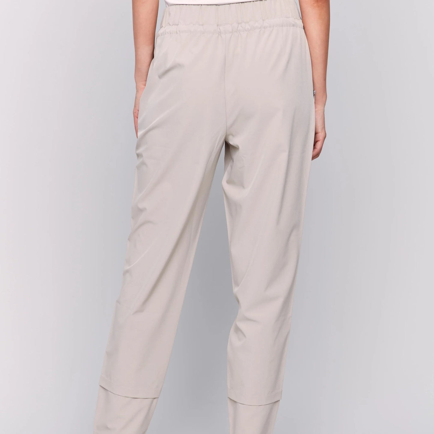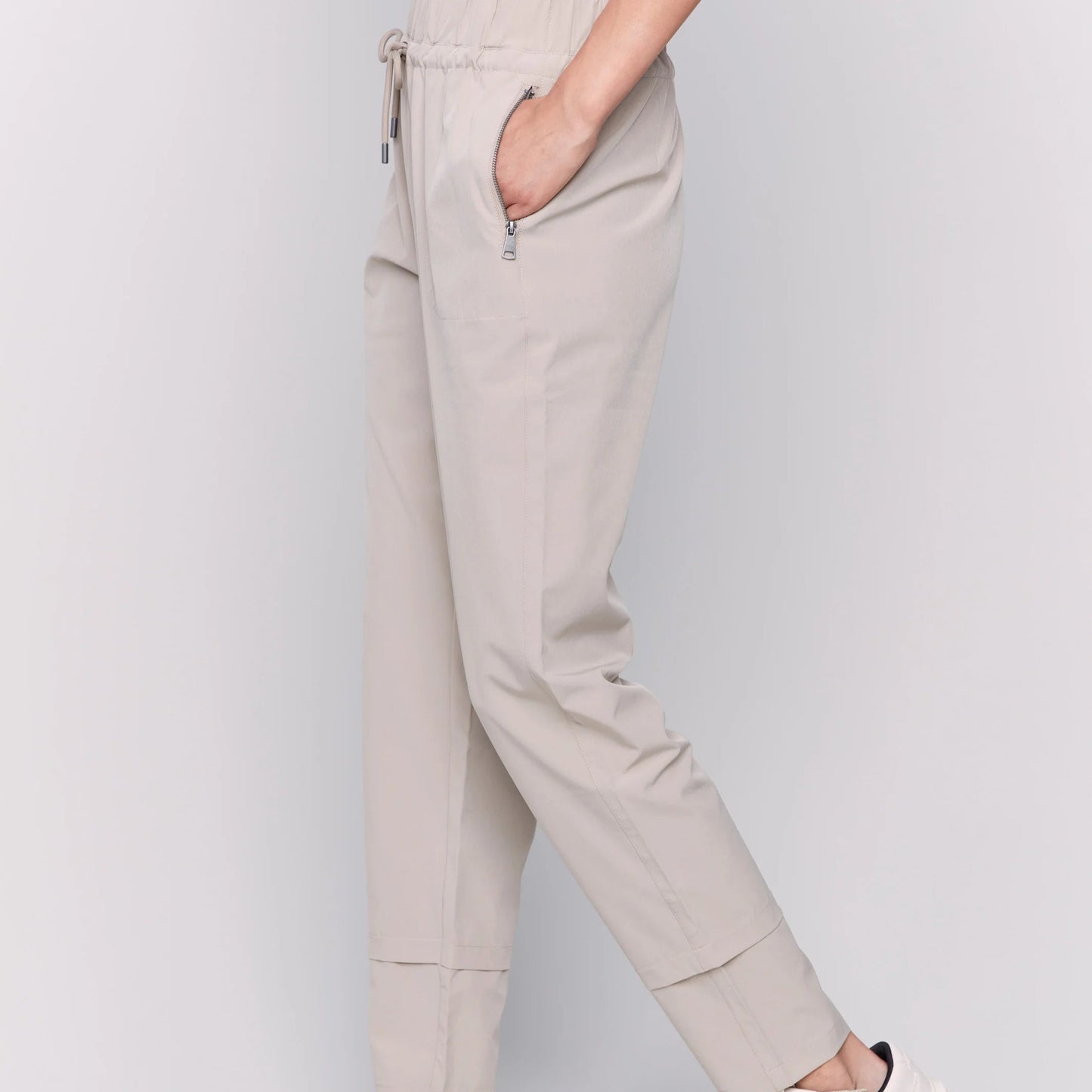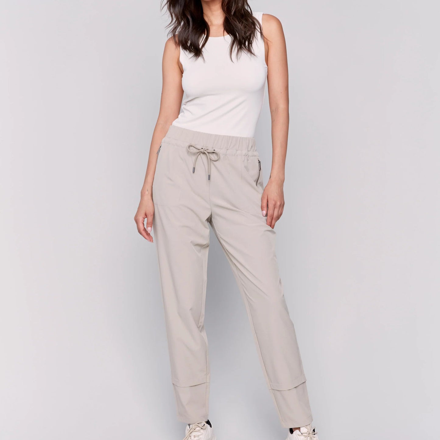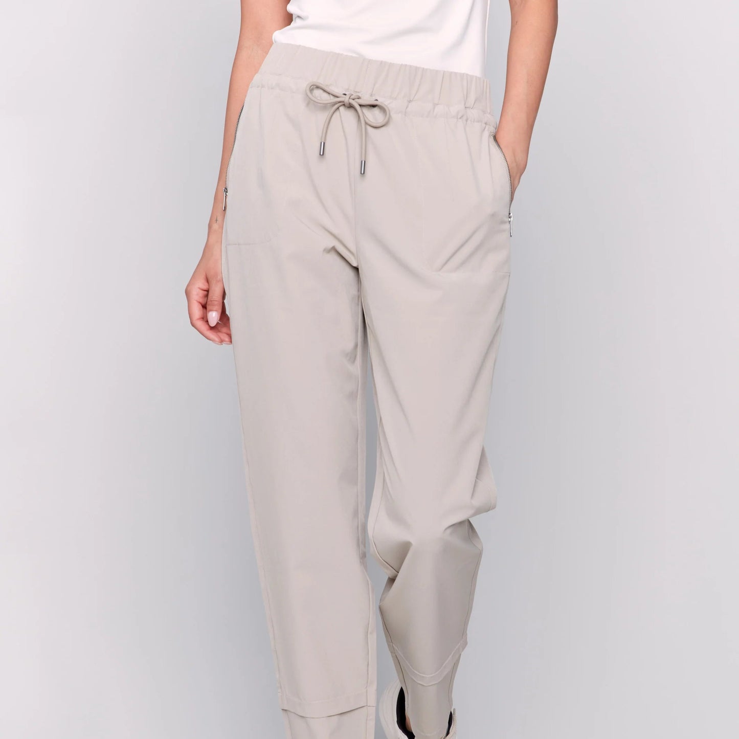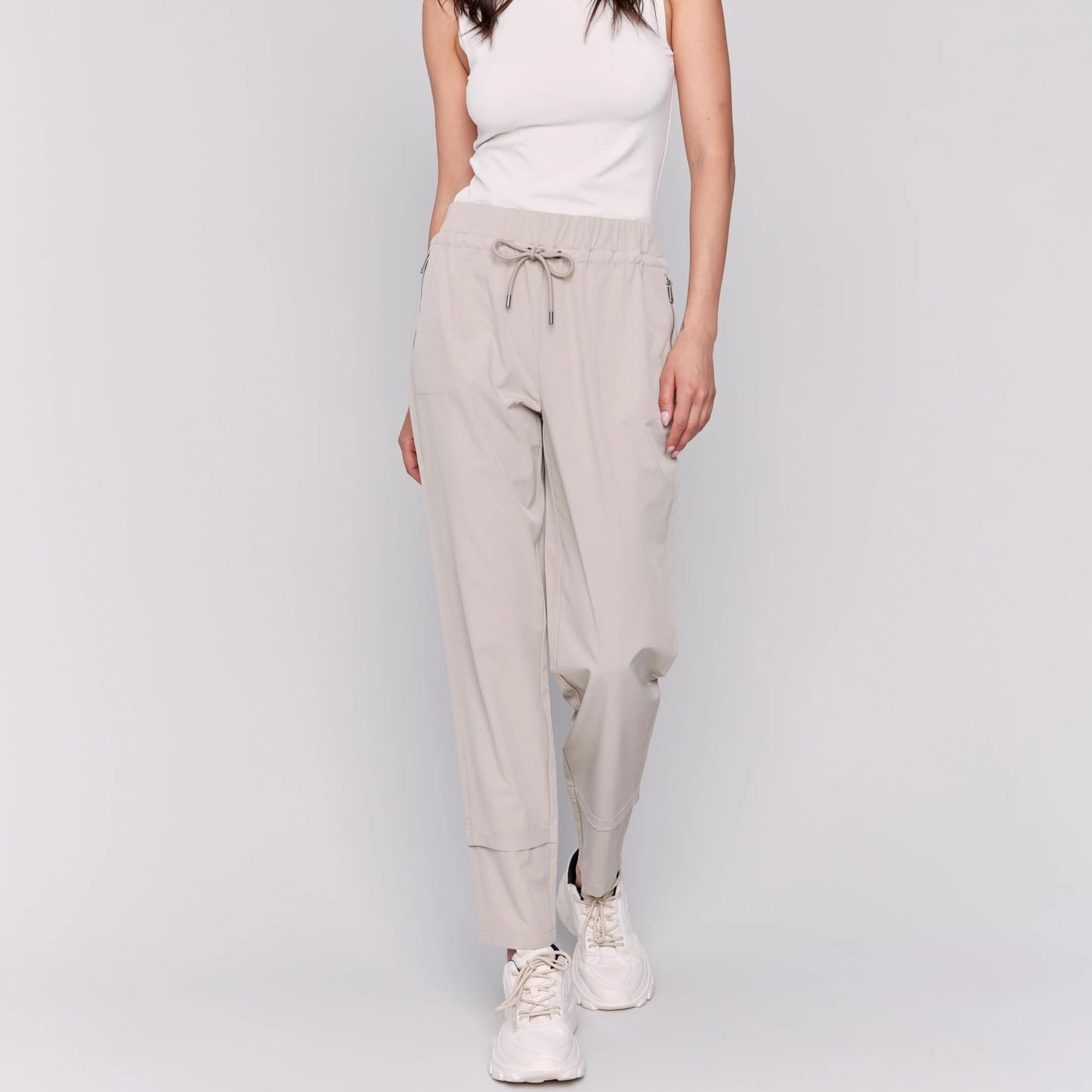 Get ready to rock your athleisure game with Charlie B's Techno Pants! Designed for women who love comfort and style, these pants will elevate your look whether you're lounging at home, running errands, or hanging out with friends. Featuring a pull-on style, elastic waistband with drawstring, side zip pockets, and cuff detail. Material is 88% polyester, 12% spandex.