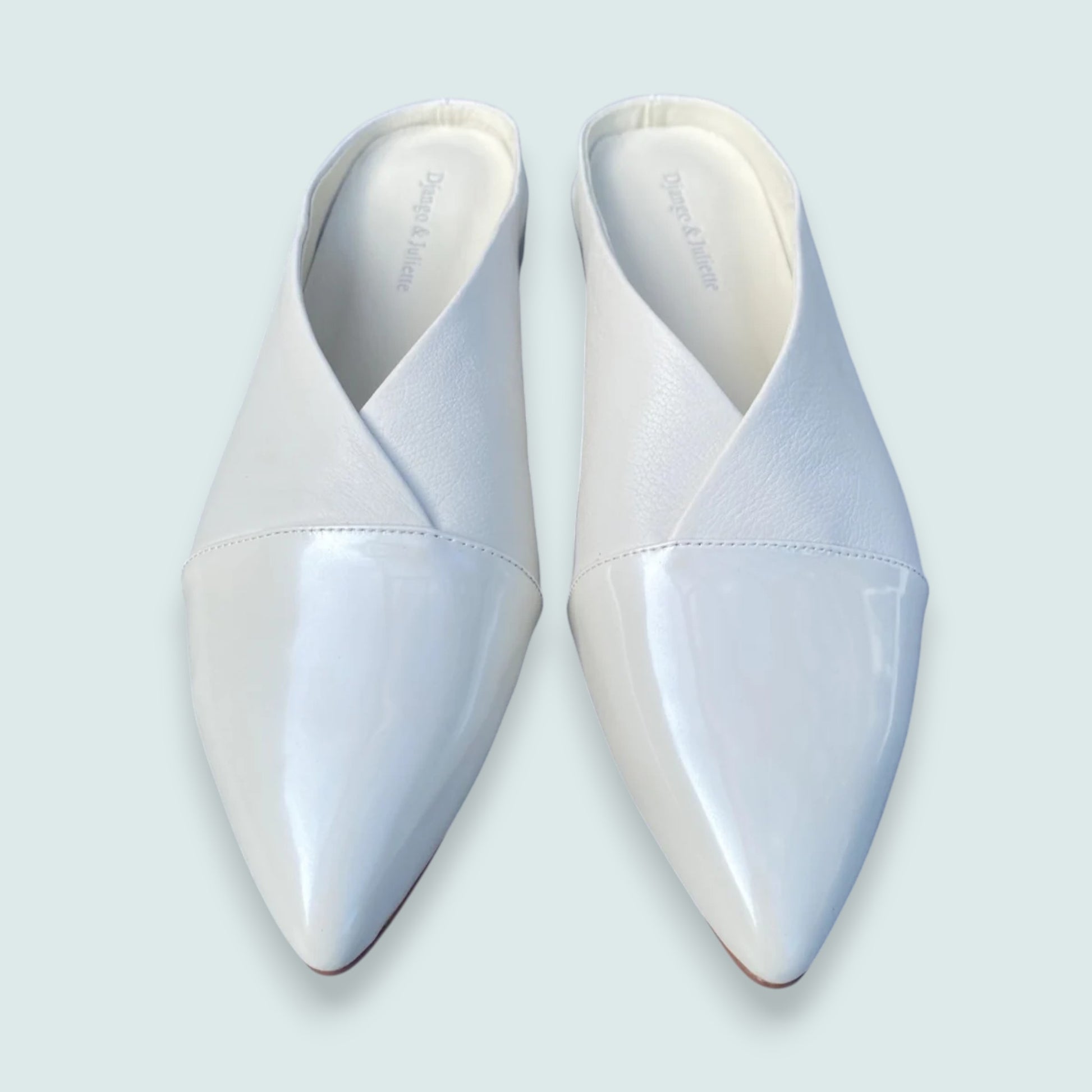 Slip into understated elegance with this ivory patent-toe mule that effortlessly elevates any outfit. The playful contrast between a glossy patent leather toe and soft matte leather creates visual intrigue, while a chic crossover detail adds personality without fuss. The streamlined silhouette and easy slip-on design make it your go-to for everything from weekend denim to office-ready tailoring. Refined, versatile, and surprisingly fun.