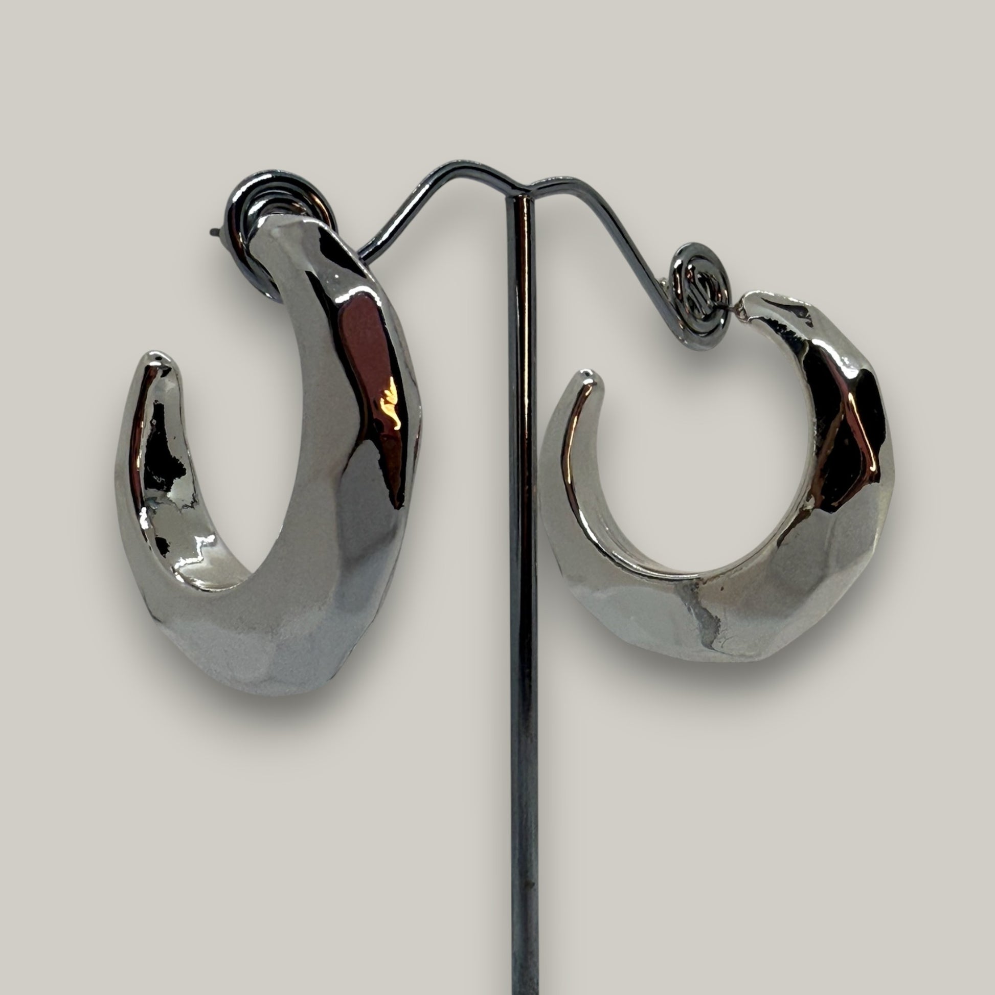 These silver-toned hoop earrings bring a fresh twist to classic style with their softly sculpted wave design that gleams with every turn. Perfect for adding a playful spark to any outfit, they balance sleek elegance with a bold edge, making them your go-to statement accessory for day or night.