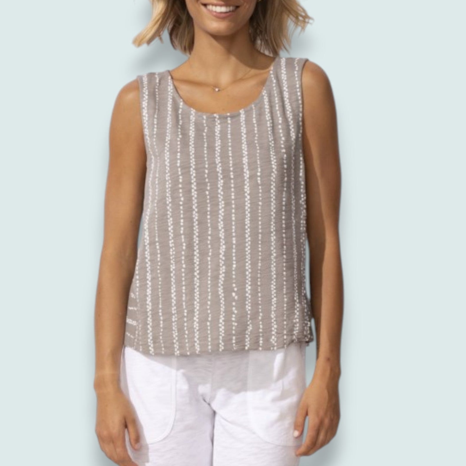 The Escape tank is your new go-to for effortless style. Featuring a flattering scoop neckline and relaxed A-line cut, this sleeveless essential skims the body beautifully while keeping you cool and comfortable. Vertical stripes add a modern, lengthening effect that works magic on any frame. Lightweight and breathable, it's the perfect layering piece or standalone summer staple—throw it on with white denim, linen trousers, or shorts and you're ready for anything. Clean, versatile, and endlessly wearable. Material is 100% cotton.