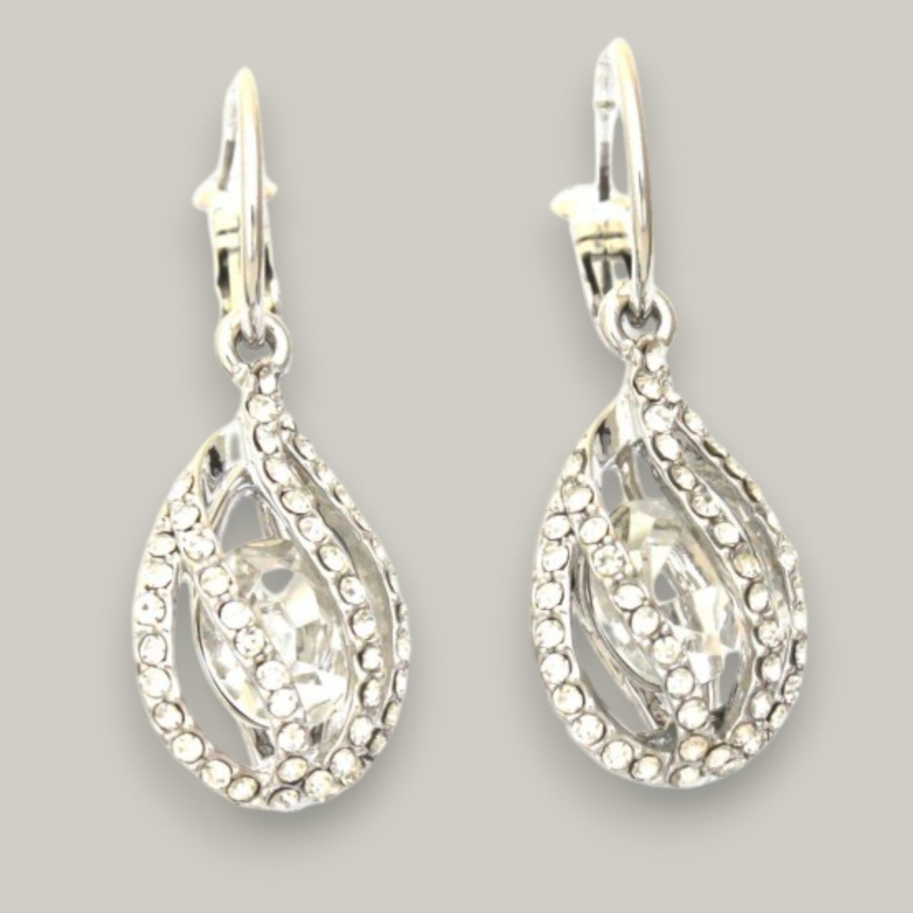 The Evershine Crystal Cage Drop Earrings feature a radiant crystal embraced by an intricate cage of rhinestone-adorned swirls. This elegant design offers a statement of polished glamour and lasting sophistication, perfect for enhancing any look.