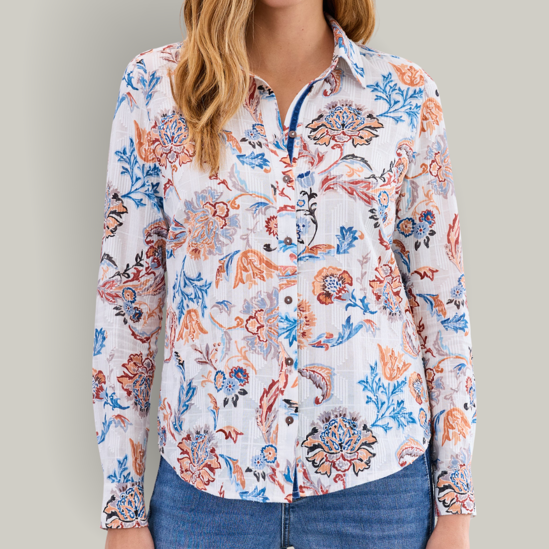 The FDJ Classic Long Sleeve Blouse combines timeless elegance with a fun flair. Designed for all-day comfort, it features a delicate floral print set against a soft white textured backdrop. With its classic collar and button-down style, this blouse effortlessly complements jeans or skirts. Whether you're off to brunch or a laid-back meeting, it brings a lively, feminine vibe to your look. Material is 100% cotton.