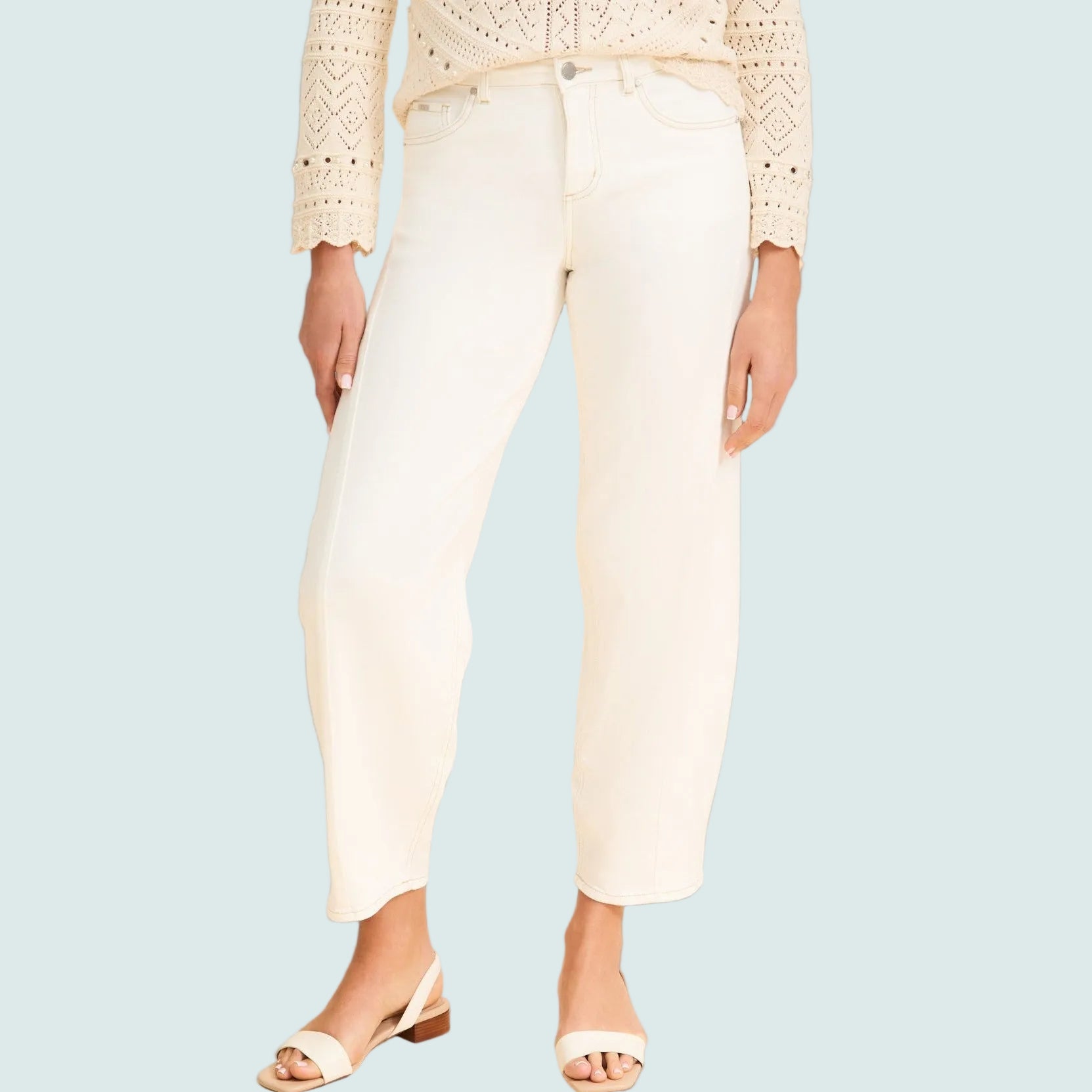Meet your new wardrobe MVP—the FDJ Ivory Girlfriend Barrel Ankle Jean. This relaxed-yet-refined silhouette hugs your hips with ease before gently tapering at the ankle for that effortlessly chic vibe. The soft barrel leg and ankle-length cut work overtime with everything from oversized knits to crisp blouses and strappy sandals. Neutral, versatile, and undeniably cool—it's the jean that makes getting dressed feel like second nature. Material is 98% cotton, 2% elastane.
