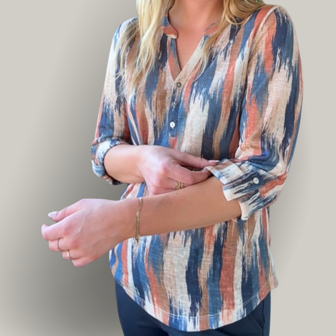 The FDJ Henley Top is your new go-to for effortless style with a playful edge. Featuring a flattering V-neck, a fun rounded hemline, and breezy 3/4 sleeves, it’s perfect for adding a splash of charm to any outfit. Comfortable and cute, this top is ready to brighten your day! Material is 100% polyester.
