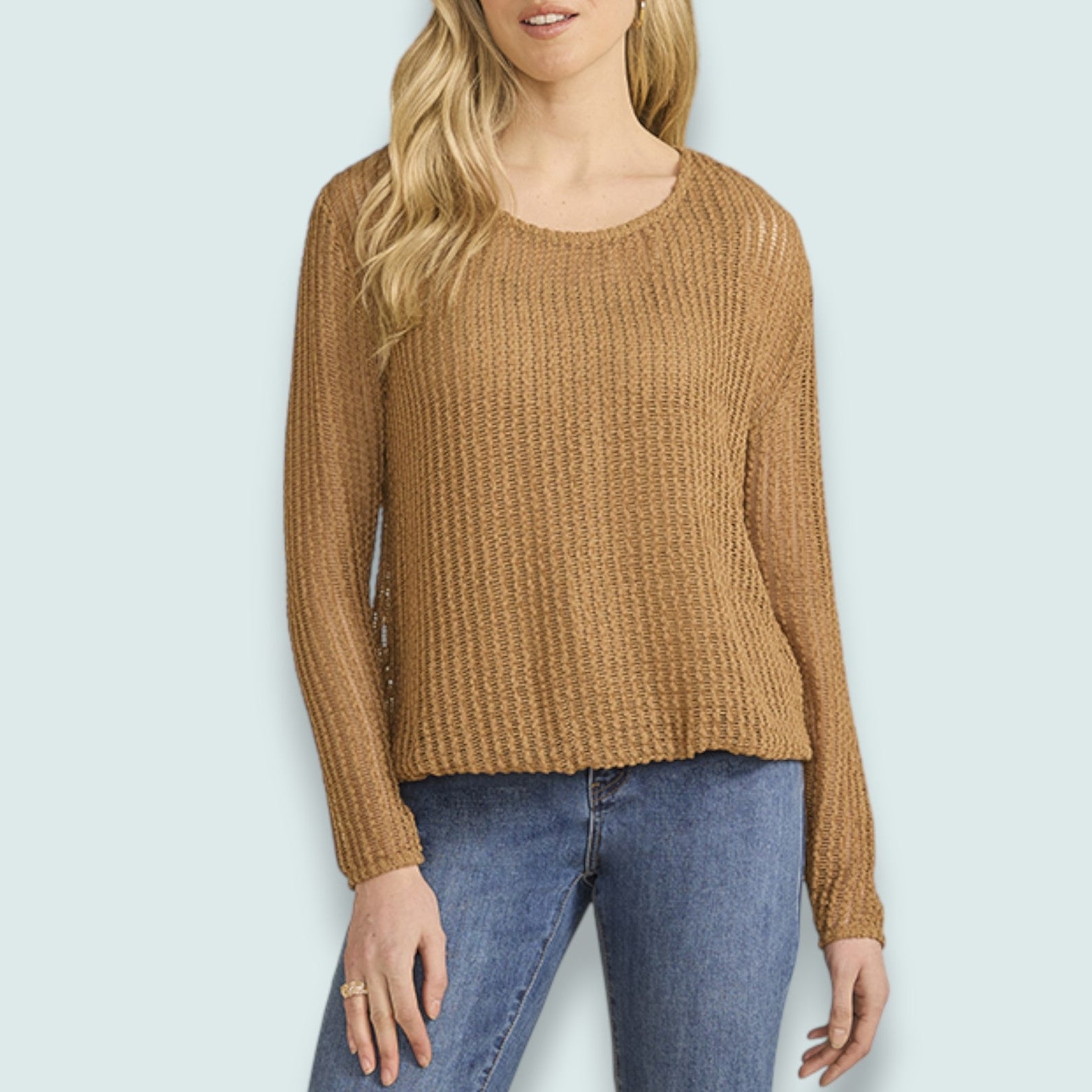 Effortless layering meets modern edge with this open knit sweater. The allover loose weave creates an airy, textured look, while the bubble hem adds unexpected movement and dimension. Lined with a tonal cotton tank featuring reinforced shoulders and hem for structure and comfort. Long sleeves, round neckline, and a cropped silhouette make it endlessly versatile.