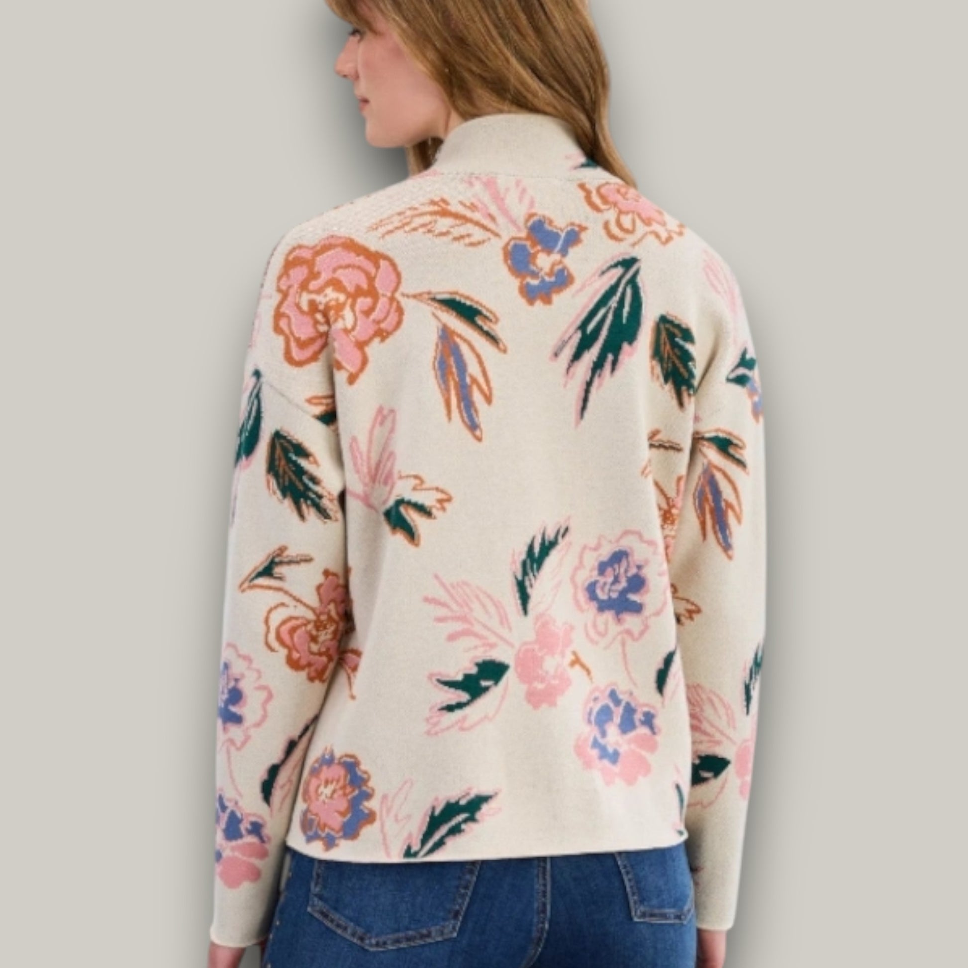 Wrap yourself in wearable art with this relaxed-fit mock-neck sweater, featuring a stunning jacquard floral print inspired by local artistry. The soft, breathable knit drapes beautifully while the botanical design brings personality and warmth to your everyday rotation. Perfect for layering or wearing solo, it's the kind of piece that makes getting dressed feel like a creative choice rather than a chore. Material is 55% viscose, 24% nylon, 21% polyester.