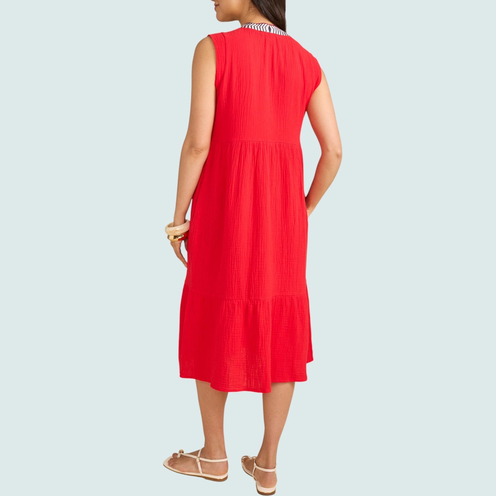Catch every sunset moment in the Sunset Tassel Midi Dress—a vibrant red stunner that's equal parts bold and breezy. This sleeveless midi features a flattering tiered silhouette, an embroidered neckline with delicate tassel ties, and lightweight textured fabric that breathes as beautifully as it drapes. The relaxed fit skims your body with effortless grace, while hidden side pockets keep your essentials close. Whether you're heading to brunch, a beach escape, or an evening stroll, this boho-inspired piece transitions seamlessly from day to night. Playful, feminine, and impossible to miss—your new warm-weather essential. Material is 100% cotton.