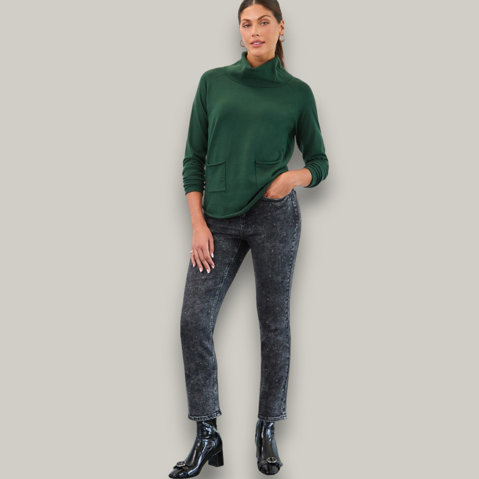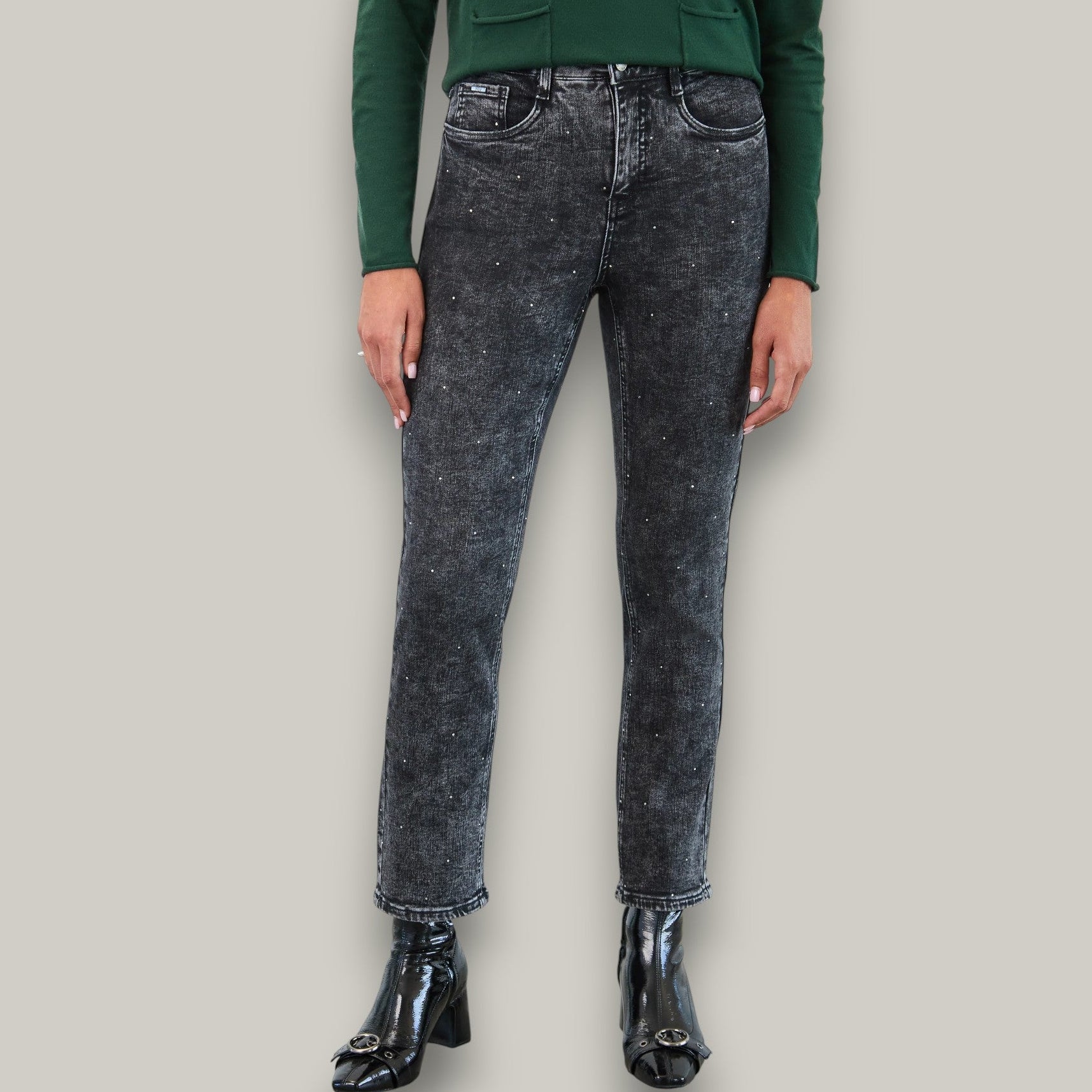 Polished by day, glam by night—the Suzanne ankle pant does it all. Crafted in a dark grey denim and adorned with delicate allover rhinestone detailing, this straight-leg beauty delivers just the right amount of sparkle without the fuss. The flattering ankle-length cut transitions effortlessly from casual daytime vibes to elevated evening looks, so you can go from coffee to cocktails in the same pair. Refined, versatile, and ready for anything. Material is 92% cotton, 6% polyester, 2% elastane.