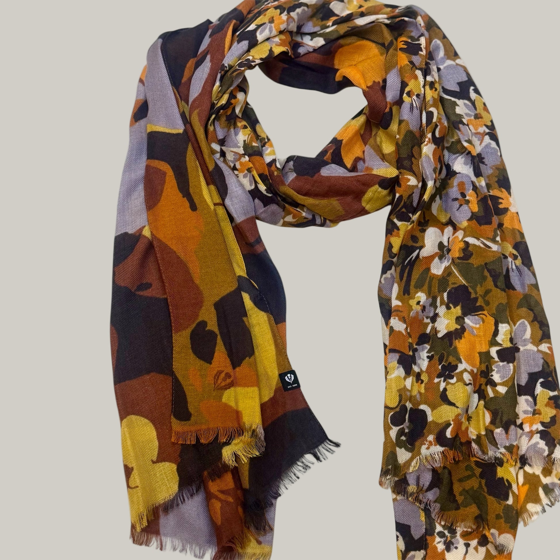 Brighten your day with the Fraas Floral Design Scarf, where playful meets pretty. Half the scarf blooms with delicate small flowers, while the other half showcases bold, large blossoms. Finished with a fringed hem, this scarf adds a fun, flirty flair to any outfit. Perfect for those who love a cheerful twist on classic floral style. Material is 100% viscose.