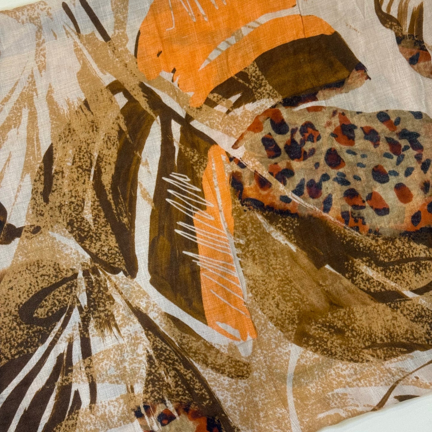 This lively viscose scarf is bursting with charm! Its warm, earthy tones create a soothing harmony that pairs perfectly with a variety of outfits. It’s the perfect playful accessory to lift your spirits and style. Material is 100% viscose.