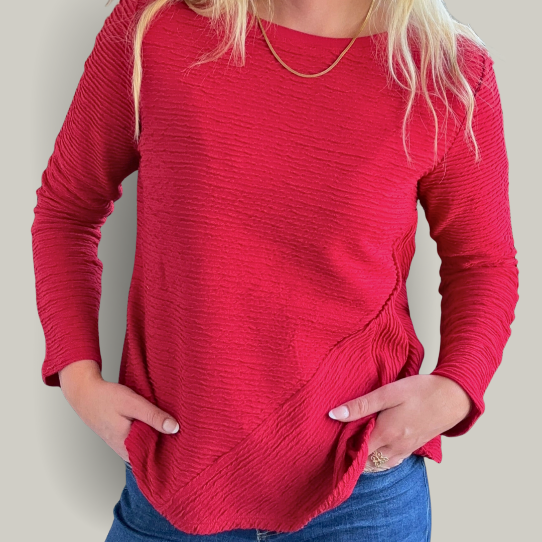 The Habitat Harvest Long Sleeve Top is your new go-to for effortless style on the move. Lightweight with a fun rippled texture, it features a flattering boat neckline and full sleeves that keep things comfy. The diagonal seam at the waist adds a quirky twist, making it perfect for days when you want to look chic without the fuss. Pack it light, wear it easy, and let your style flow all day long! Material is 100% cotton.