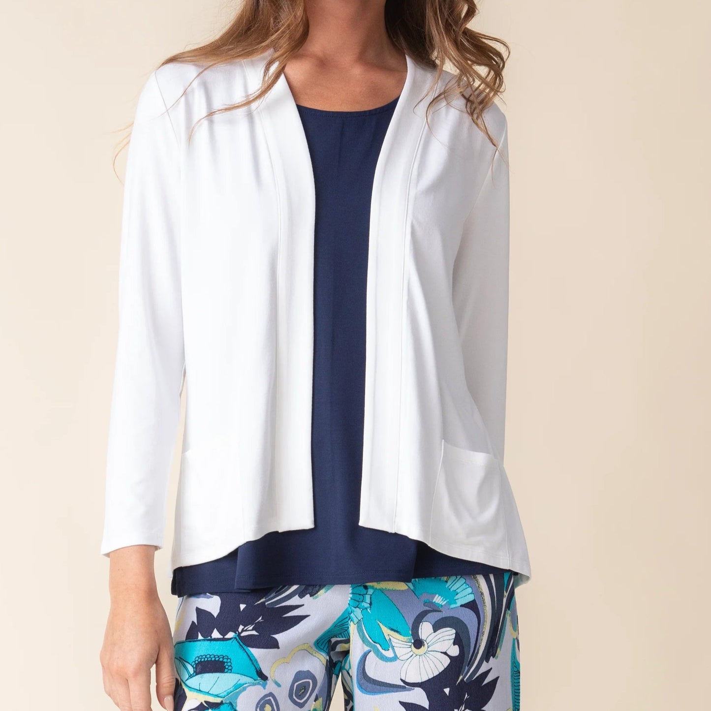 Stay comfortable and stylish with our Habitat cardigan. Featuring a unique pleated back, this open front cardigan is the perfect little travel jacket. Look effortlessly chic while also covering your arms, making it a versatile layer over tanks and dresses. Material is 95% rayon, 5% spandex.