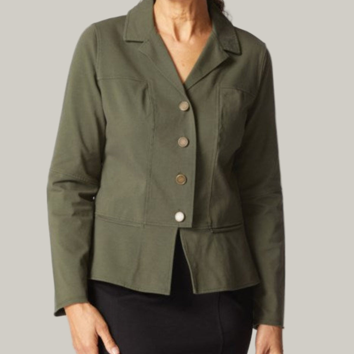 Add a fun twist to your wardrobe with the Habitat - Urban Jacket! Featuring a flirty peplum hem that adds a playful flair and hidden front pockets perfect for stashing your essentials on the go. This jacket combines style and practicality effortlessly, making it your new favorite urban companion. Material is 92% cotton, 8% spandex.