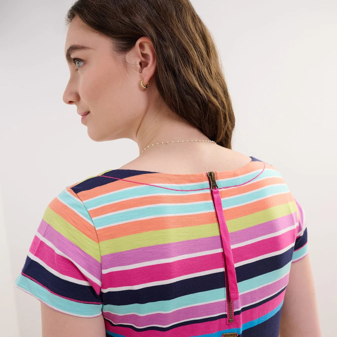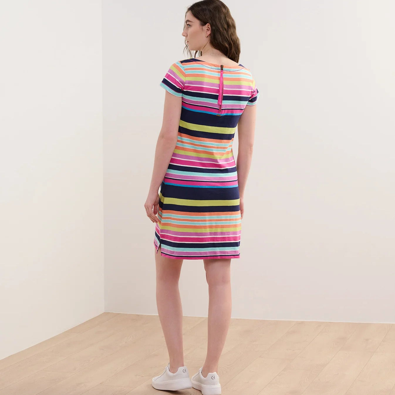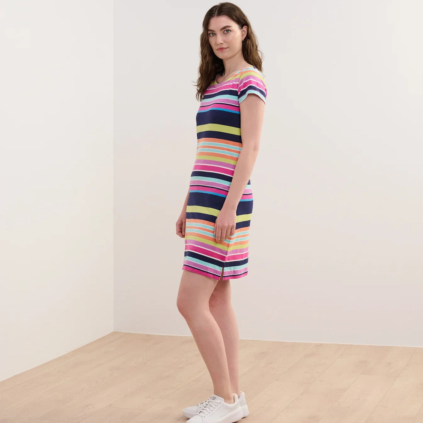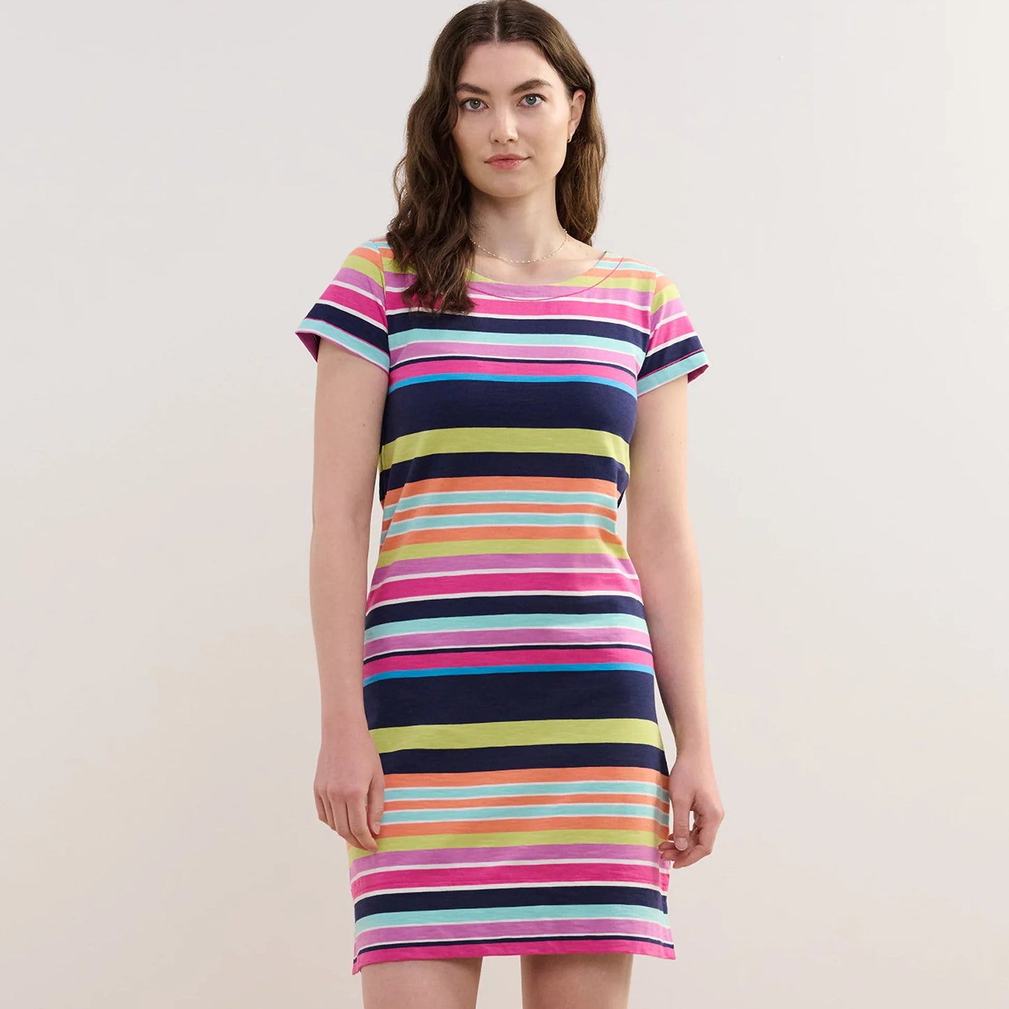 Get ready to turn heads with the Hatley Nellie Dress! Stand out in this bold, hot striped t-shirt dress featuring an exposed back zipper and flattering A-line silhouette. Made from breathable cotton, this dress offers both comfort and style. Perfect for any occasion, pair with sandals or heels for a versatile, polished look. Material is 100% cotton