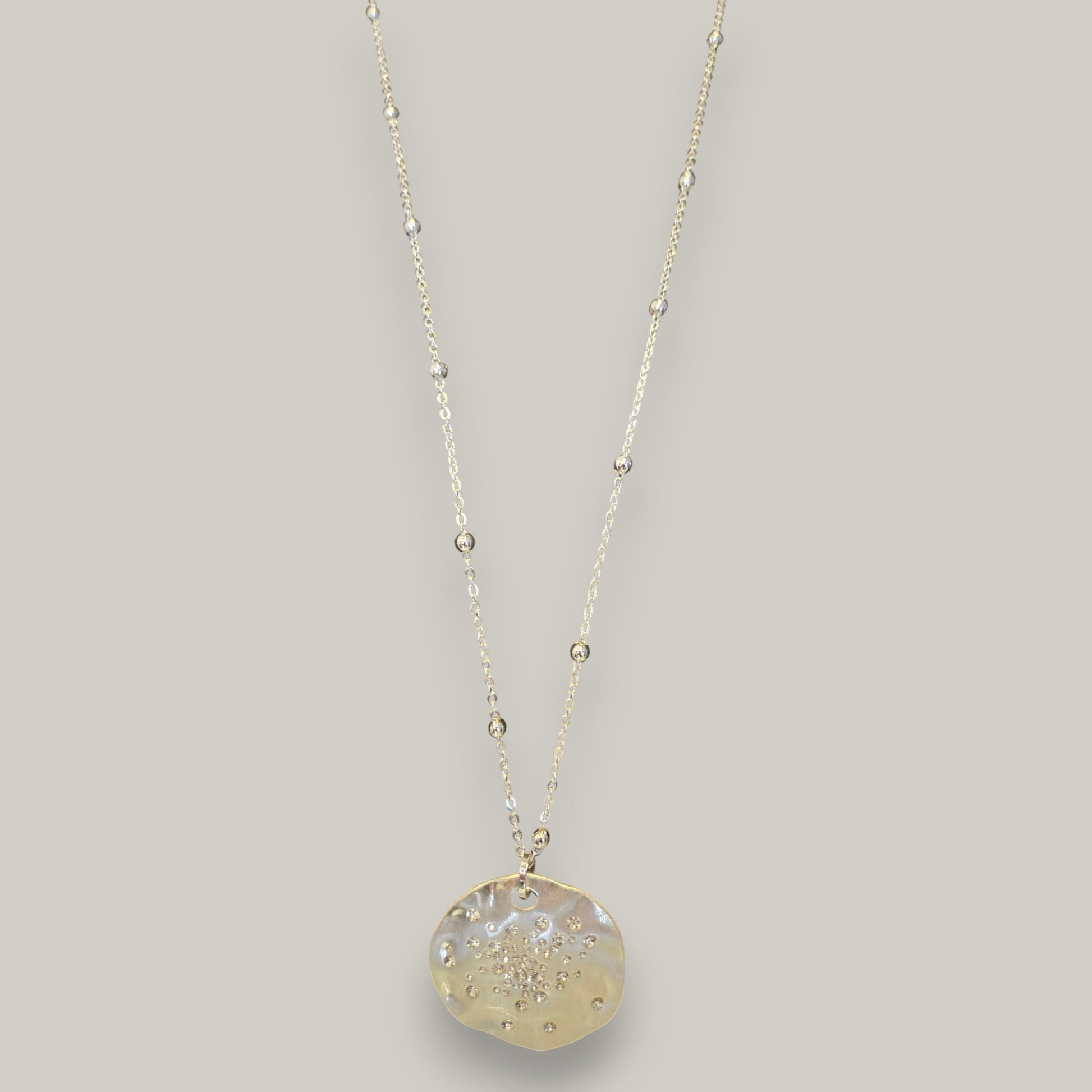 The KBS - Celestial Ripple Pendant Necklace features shimmering crystal accents set on softly hammered discs, evoking the serene sparkle of starlight dancing on water. This elegant yet modern piece offers a radiant finish that effortlessly enhances any outfit, adding a touch of timeless beauty and grace you'll love to wear daily.