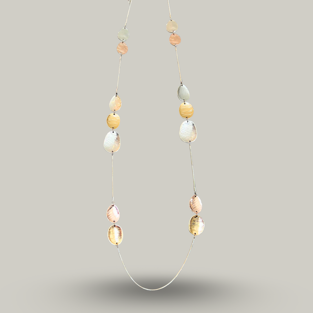 This long, fine-featured necklace is a delicate and sophisticated piece that draws attention with its intricate design. The necklace is composed of multiple metal medallions, each meticulously crafted with detailed patterns or subtle engravings. These medallions are linked together by slender, almost invisible chains, creating a continuous flow that drapes elegantly. The medallions vary slightly in size or design, adding visual interest while maintaining a cohesive look. The metals might include a mix of silver, gold, and perhaps rose gold, offering a subtle contrast and a touch of warmth. The overall effect is one of understated luxury, with the fine chain allowing the medallions to stand out without overwhelming the design. This necklace is perfect for layering or wearing on its own as a statement piece, adding a touch of elegance to any outfit.