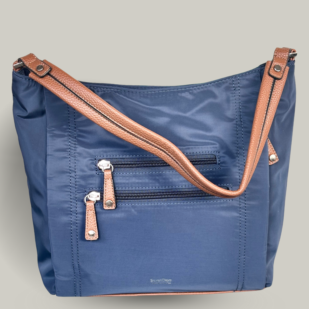 This playful La Diva nylon purse keeps your essentials stylishly secure with four zip closures—top, two front, and one back. Carry it crossbody or by hand for versatile fun. Inside, find a zip pocket, two slip pockets, and four pen slots to keep everything organized and ready for your next adventure.