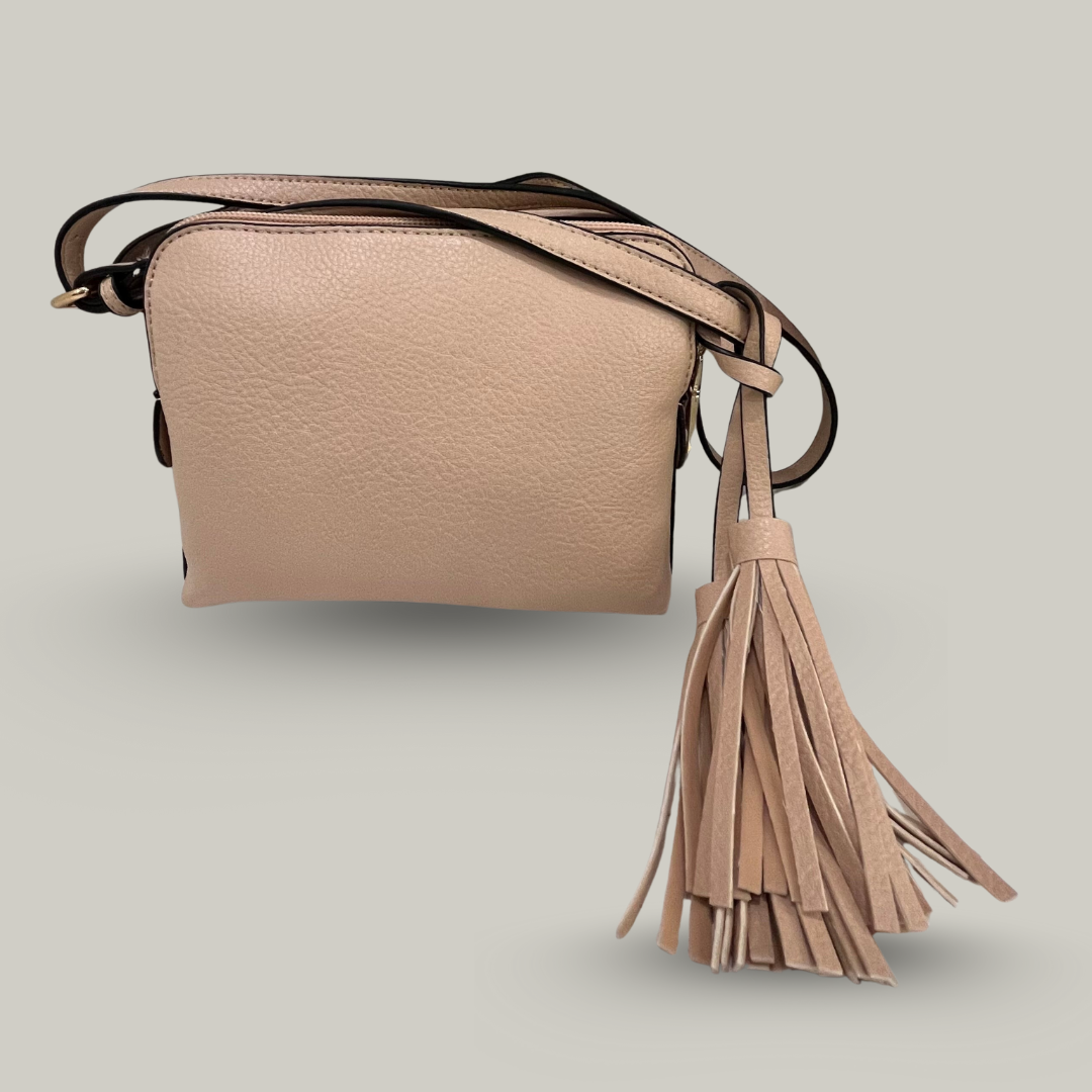 Introducing La Diva's Cross-Body Handbag! This stylish and versatile handbag features three top zip compartments and double slip pockets, providing ample space for all your essentials. With an adjustable strap and removable tassels, it offers customizable convenience. The interior includes a zip pocket and slip pocket, keeping your belongings organized. Experience ultimate functionality and fashion with La Diva's Cross-Body Handbag.