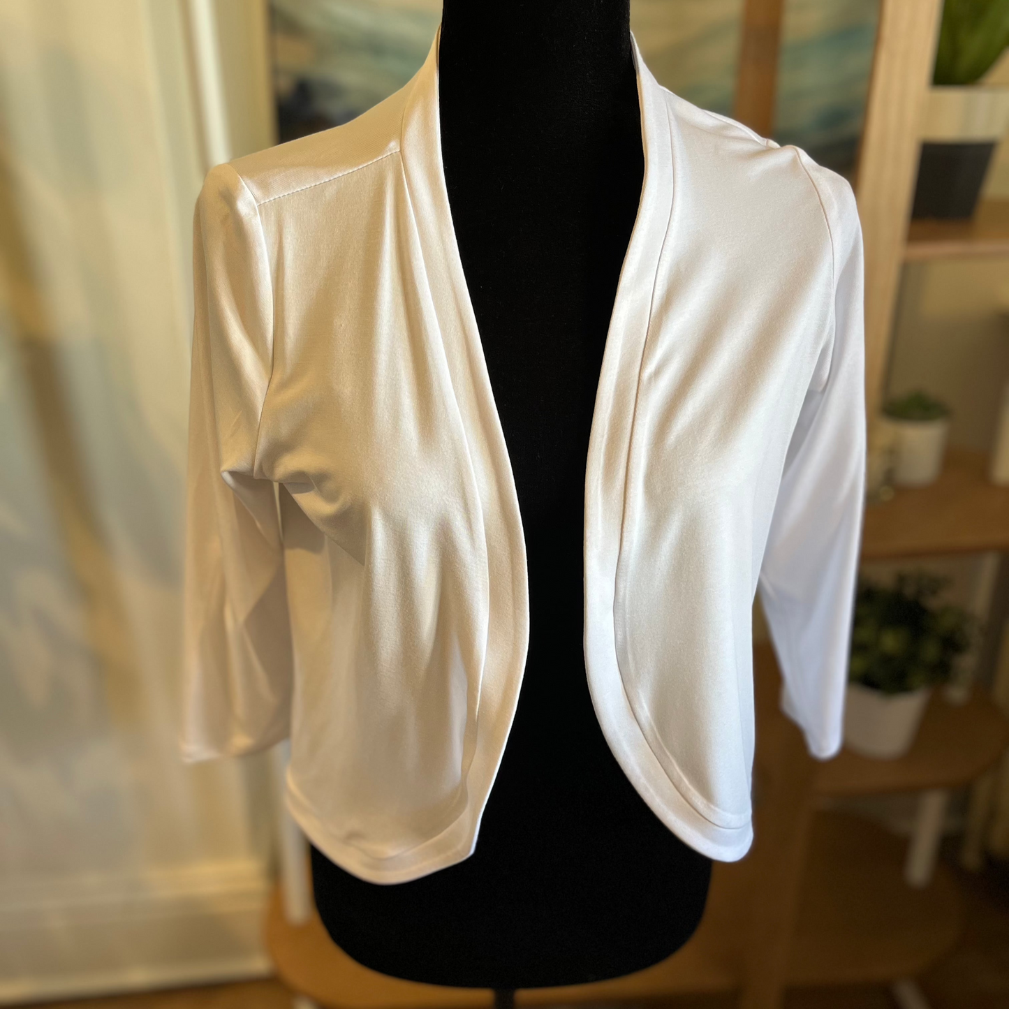Bolero style open cardigan with 3/4 length sleeves. Material is 92% Modal 8% spandex.