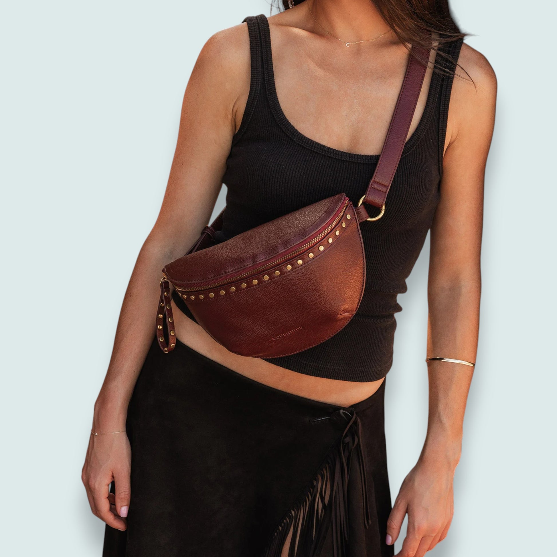 Turn heads with the Louenhide Cassidy Belt Bag—the accessory that works as hard as you do. Crafted from sleek faux leather and finished with striking studs and refined hardware, this bag brings instant edge to your everyday look. Its graceful curved silhouette molds to your body, while the flexible strap transforms it from belt bag to crossbody in seconds. Small enough to keep things streamlined, roomy enough for all your essentials—it's the perfect pocket-sized companion for life on the move. Available in rich burgundy and classic black, the Cassidy proves that style and practicality don't have to compete.