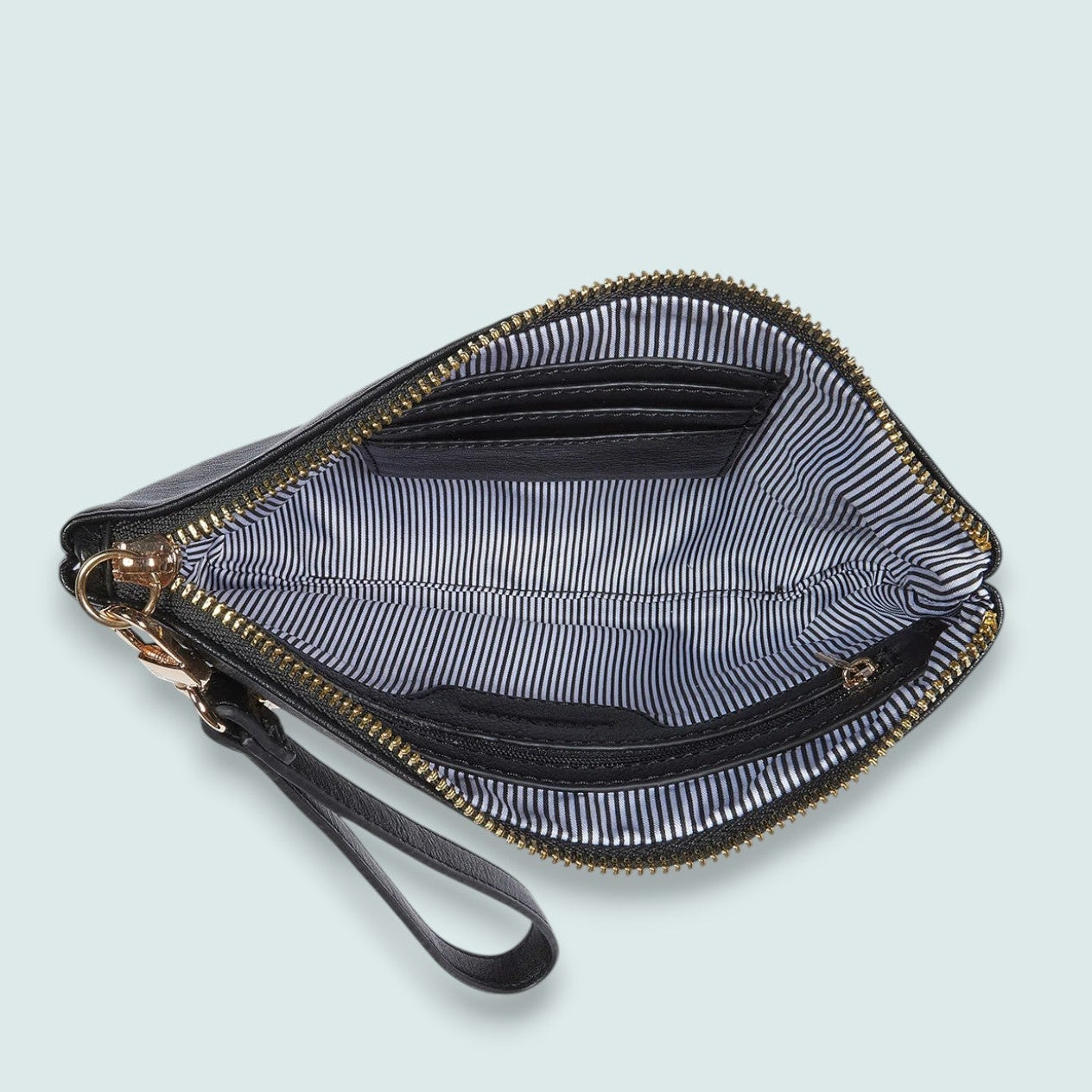 Introducing the Louenhide Mimi Logo Wristlet—your new essential for every occasion. Switch between interchangeable webbing and vegan leather straps to take your look from laid-back daytime to sophisticated night out in seconds. This sleek clutch features premium vegan leather in classic shades and packs all your daily must-haves into one compact design. Adaptable, effortlessly cool, and always ready to go.