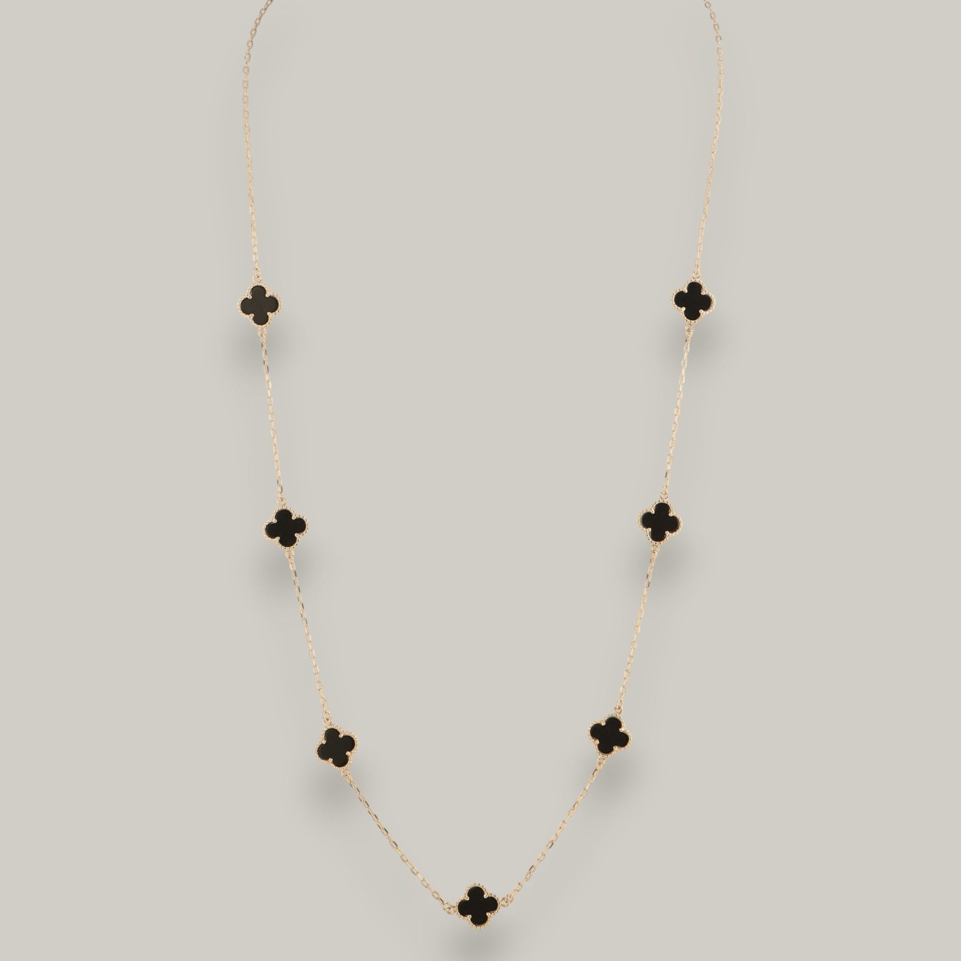 Brighten your outfit with the Merx Black Enamel Clover Necklace—a gold chain sprinkled with adorable black enamel clover charms. This playful accessory adds a dash of luck and whimsy to any look, perfect for fun days or nights out. Layer it up or wear it solo to keep your style effortlessly charming.