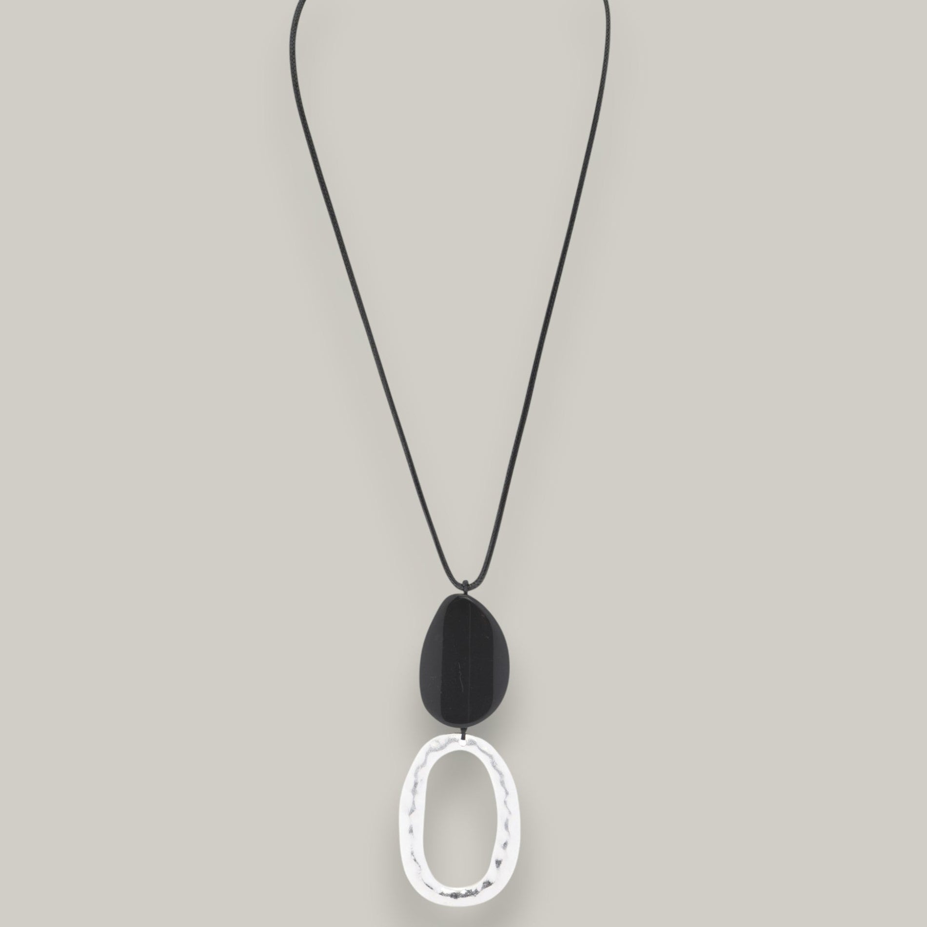 Add a touch of edgy charm to your look with the Merx - Black & Silver Hammered Pendant. This playful necklace pairs a textured hammered oval pendant with a sleek black wax cord, blending style and comfort for everyday adventures. Whether layering up or making a statement solo, it’s the perfect companion to keep your vibe effortlessly cool.
