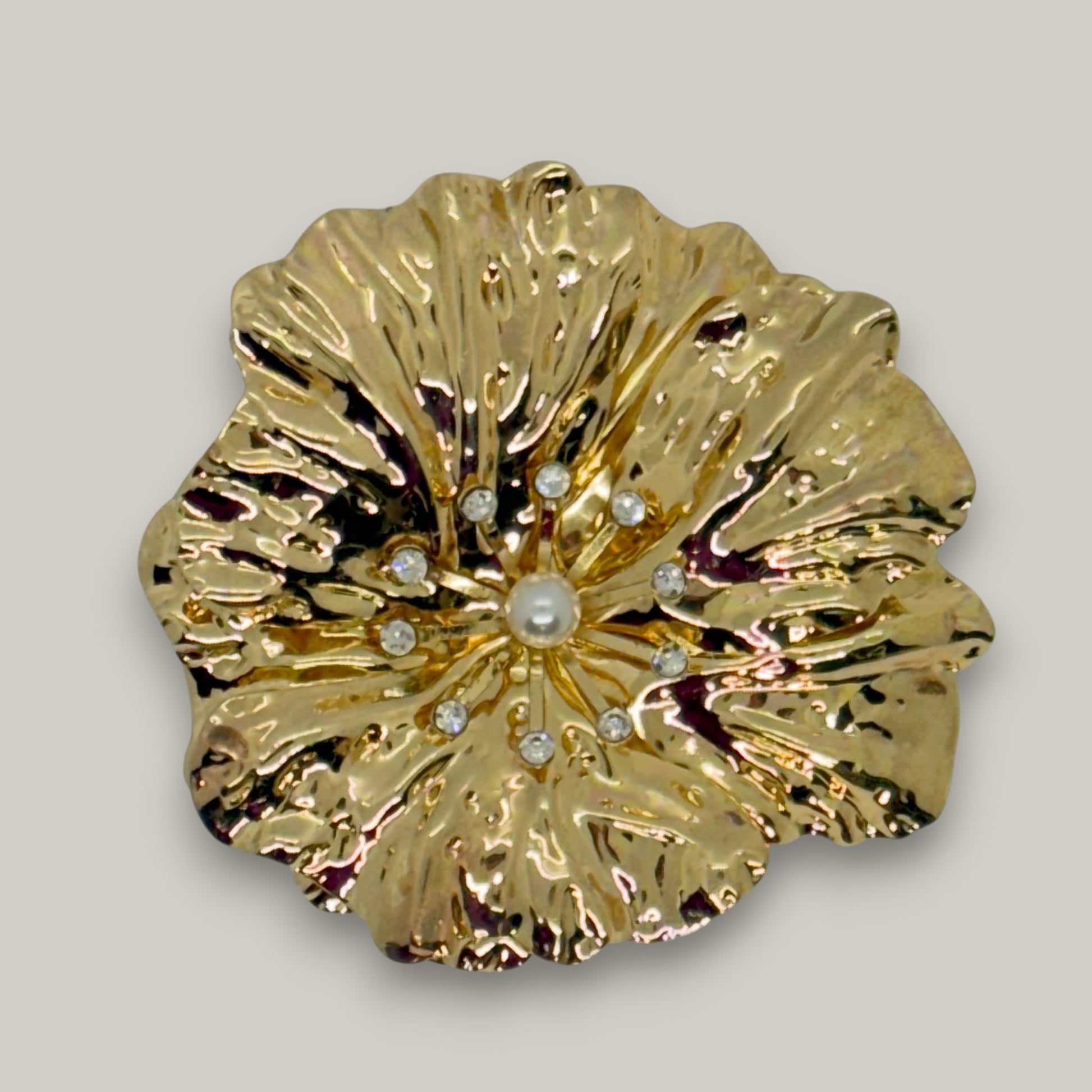 Add a touch of sparkle with the Merx - Golden Bloom Brooch! Its rippled metallic petals shimmer around a pearl center, all twinkling with dazzling crystals. This playful, elegant accessory is perfect for brightening up your blazer, scarf, or evening dress with a splash of timeless glam.