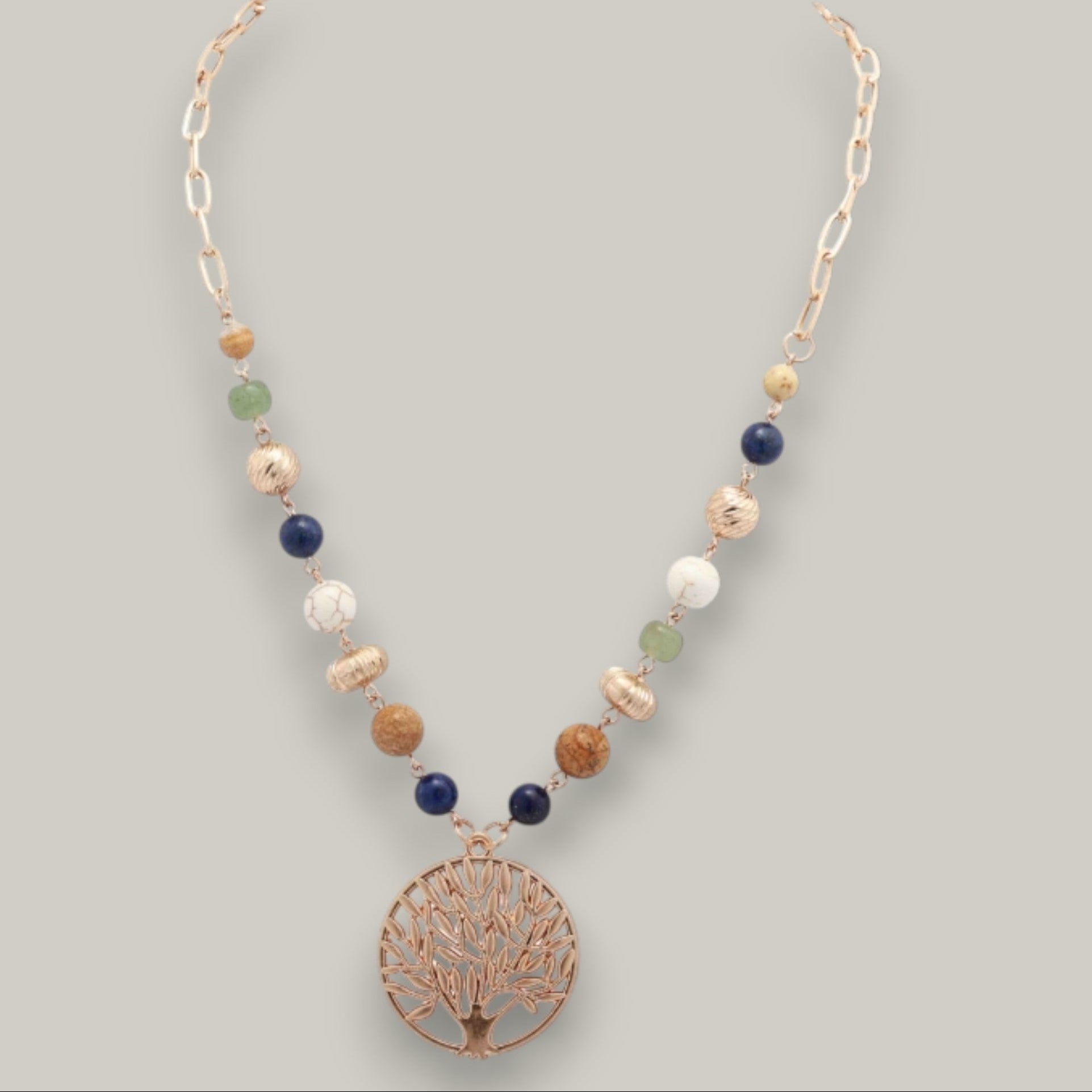 Discover the magic of nature with the Merx Heritage Tree Medallion Necklace—where earthy vibes meet timeless symbolism. This stunning piece combines smooth natural stone beads with warm gold-toned accents, all anchored by an intricate Tree of Life pendant that whispers stories of growth and connection. Whether you're channeling bohemian wanderlust or simply craving a meaningful accessory that feels like a warm hug, this necklace delivers organic beauty with zero fuss.