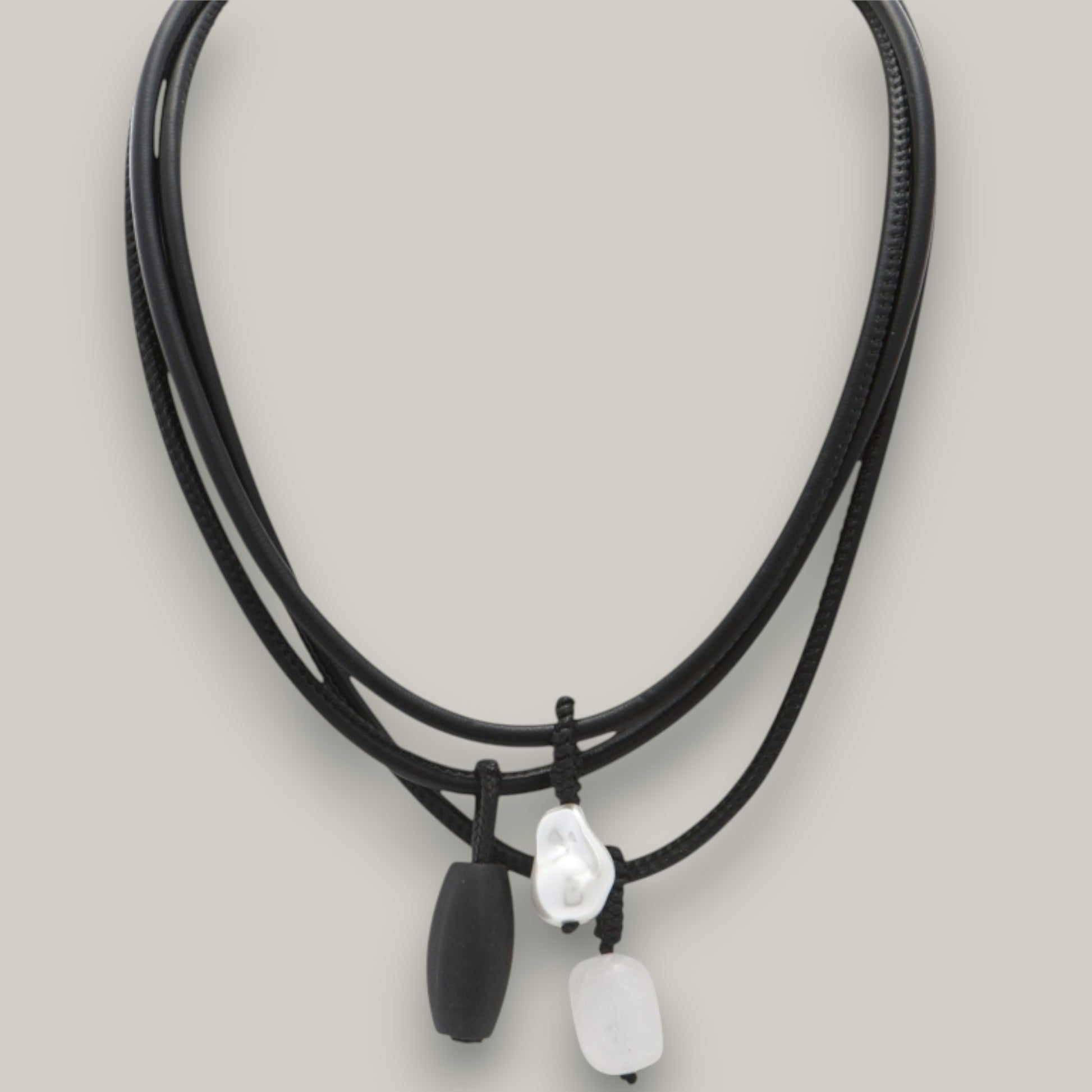 This isn't your typical necklace—it's a three-act performance. Matte black, soft silver, and frosted stone drops dangle from a sleek multi-strand cord that transitions seamlessly from desk to dinner. Modern, unfussy, and endlessly wearable.