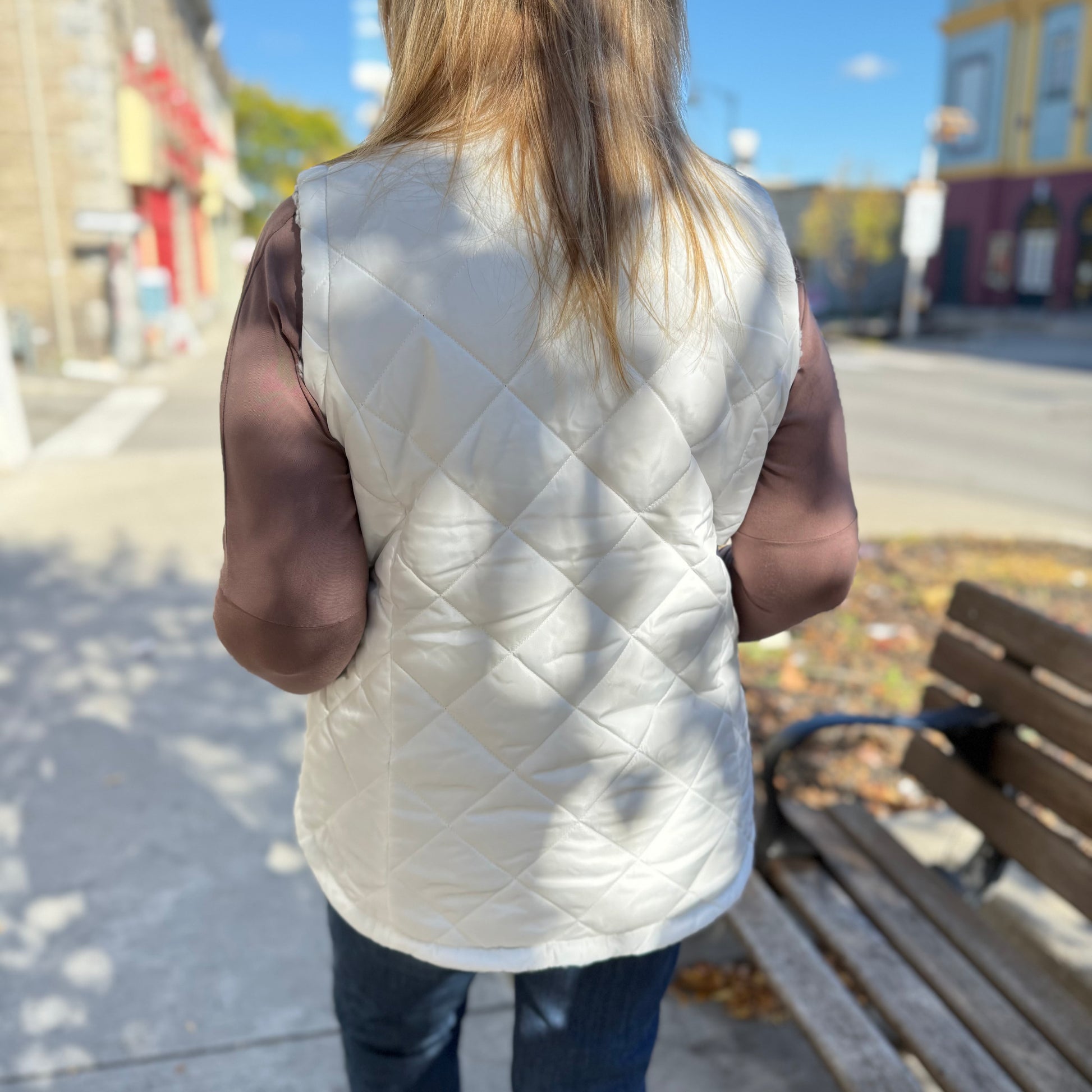 Double the style, double the fun! The Moffi Reversible Sherpa Vest offers two looks in one — quilted on one side for a polished finish, and soft, cozy sherpa on the other. Designed with a flattering cut, full zip collar, and convenient zippered pockets, it’s as practical as it is stylish. Layer it over your favorite sweaters or turtlenecks to instantly upgrade your fall wardrobe. Material is 100% polyester.