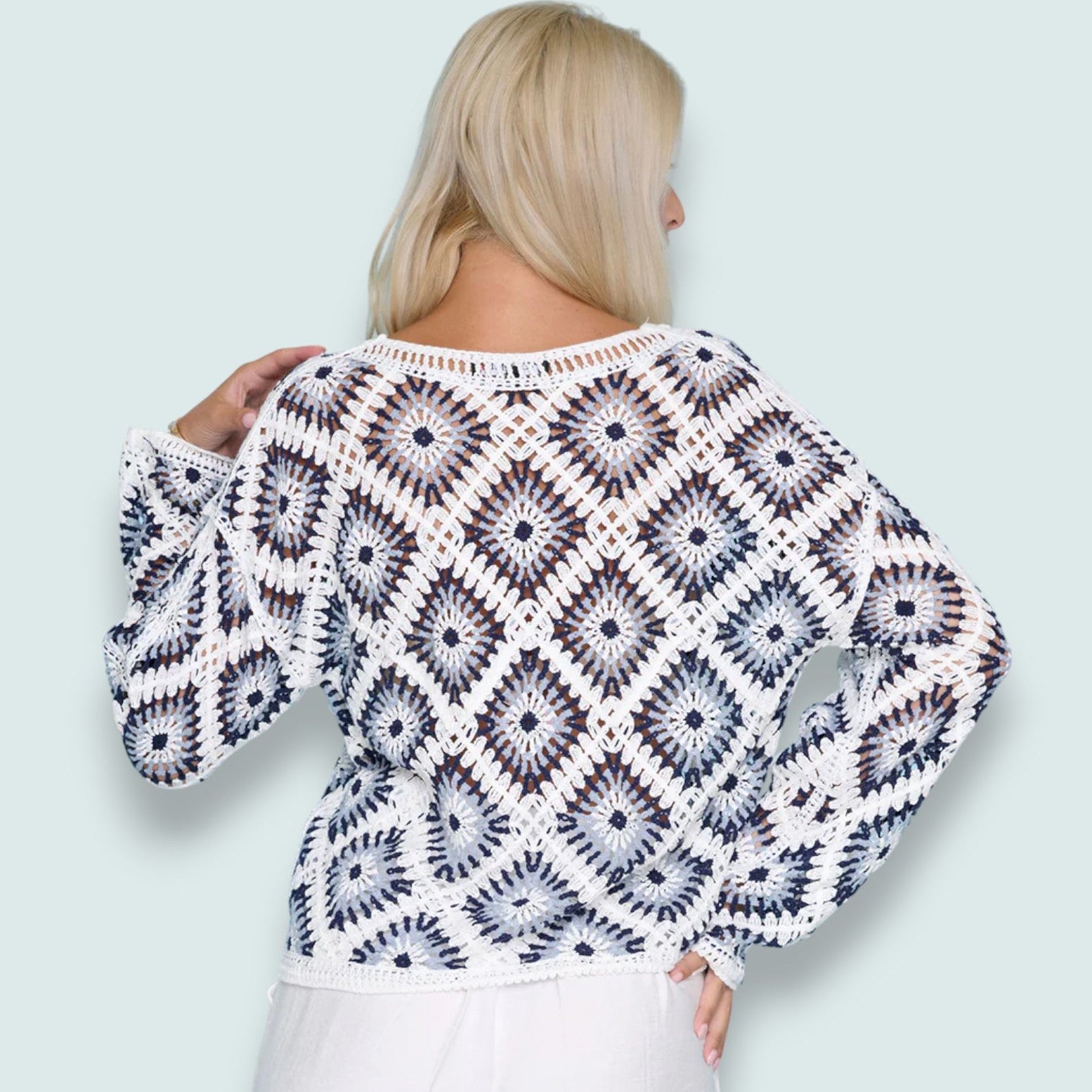 Introducing the Picadilly Square Crochet Top—your new spring essential with serious style credentials. This artisanal piece features intricate diamond multi-color crochet detailing that catches light beautifully, paired with breathable openwork for warm-weather comfort. The relaxed fit works magic with light denim or flowing wide-leg pants, while long sleeves and a round neckline keep things effortlessly chic. Material is 60% cotton, 40% acrylic.
