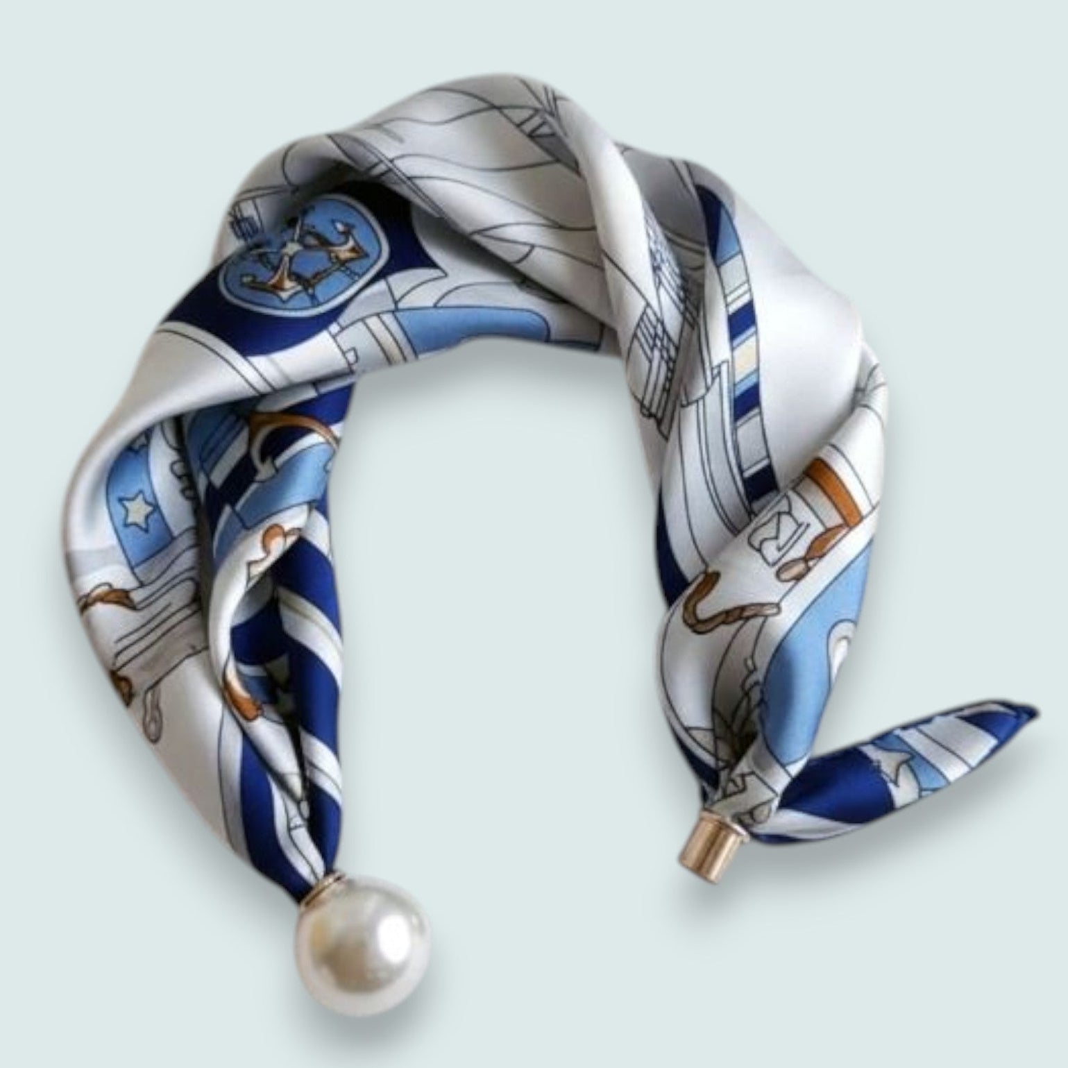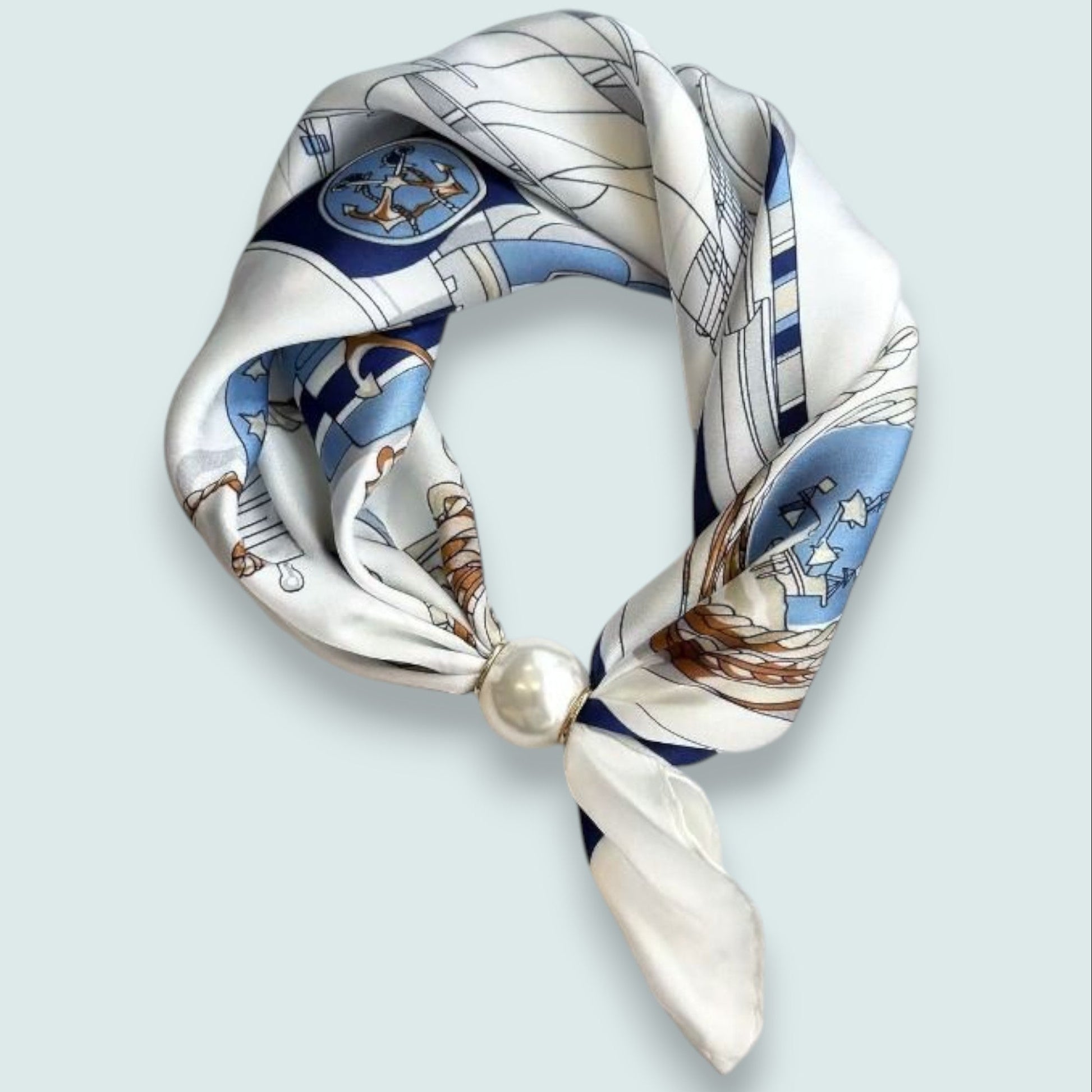 Set sail with understated elegance. This maritime-inspired neck scarf weaves sailboats, braided rope, and heraldic motifs into a refined ivory, navy, and gold palette. A lustrous pearl accent cinches the neckline for a polished, effortless touch that works beautifully draped over tailored pieces or casual layers. Nautical charm meets everyday sophistication—the perfect accessory for those who love a hint of seaside allure without the fuss.