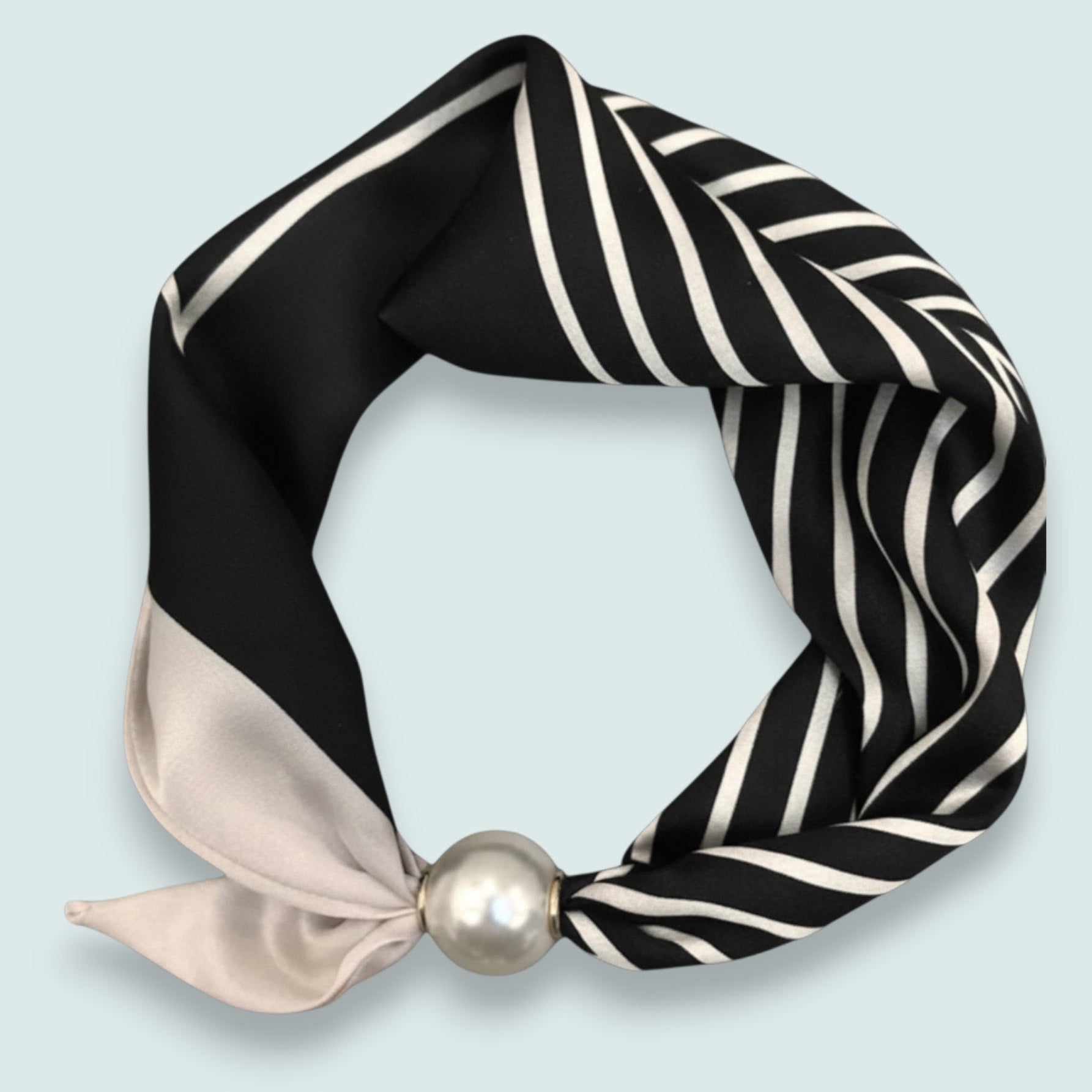 This magnetic neck scarf brings graphic punch with its bold black-and-ivory stripe pattern and luminous faux pearl fastener. Skip the knots and ties—the magnetic closure snaps shut in seconds for a polished finish every time. A playful, low-maintenance accessory that elevates any look without the fuss.