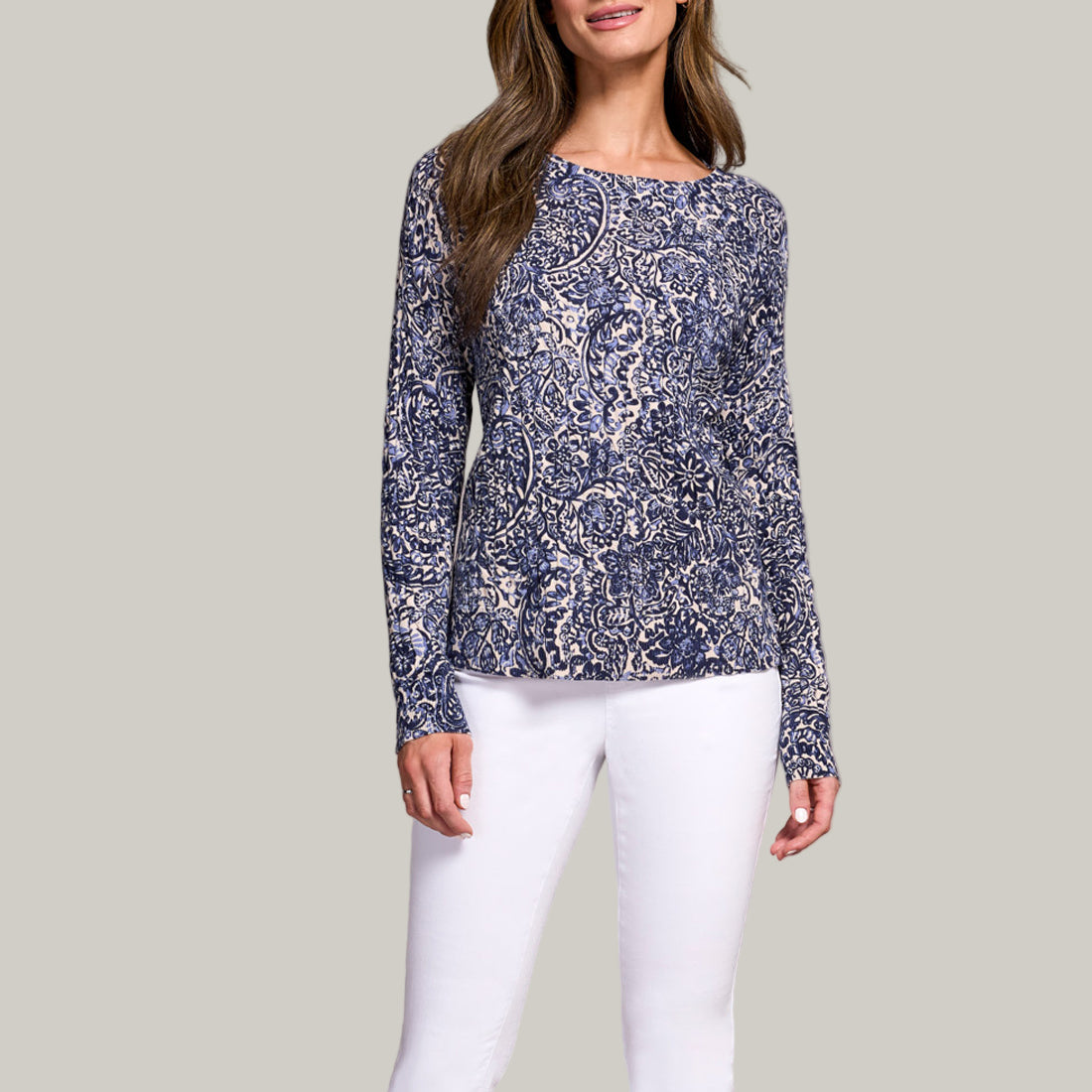 Bring a playful vibe to your outfit with the Tribal Printed Cable Cotton Crew Neck Sweater. Featuring a cozy crew neck, long sleeves, and a fun printed pattern, this sweater adds a cheerful touch to your everyday style. Material is 100% cotton.