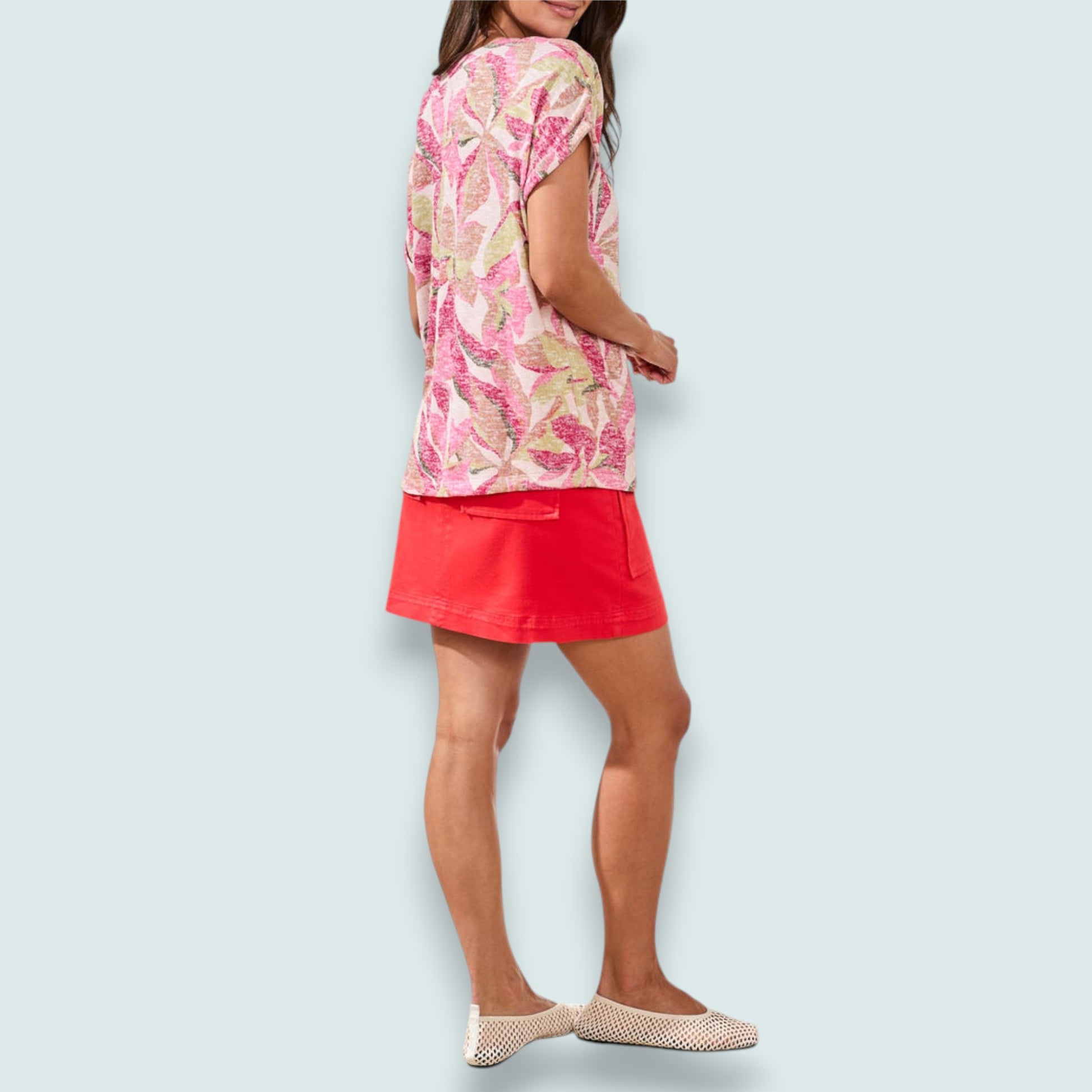 Make it yours with flip-flop necklines—V-neck when you're feeling modern, boat neck when you want timeless polish. The bold tribal design instantly elevates any look, whether you're pairing it with your favorite jeans or flowing linen bottoms. Feather-light and impossibly breathable, this cap sleeve wonder keeps you cool without sacrificing style. Your new warm-weather essential that adapts to however you want to wear it. Material is 53% polyester, 43% viscose, 4% spandex.