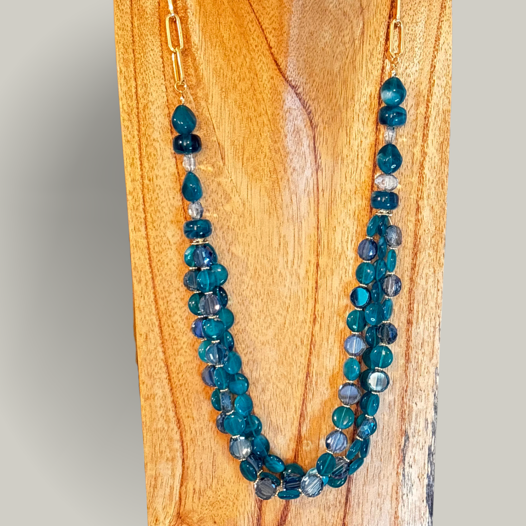 This necklace is a delicate yet striking piece, featuring two toned mini beads that exude elegance. Each bead has a smooth finish, creating a seamless flow of subtle tones that enhance the simplicity of the design. The uniform size and tones of the colours mixed in with gold gives the necklace a refined, minimalist aesthetic, making it a versatile accessory for any outfit. Lightweight and comfortable, it’s perfect for adding a touch of sophistication to your everyday style or as a subtle accent for more formal occasions. Ideal for those who appreciate the beauty of simplicity.
