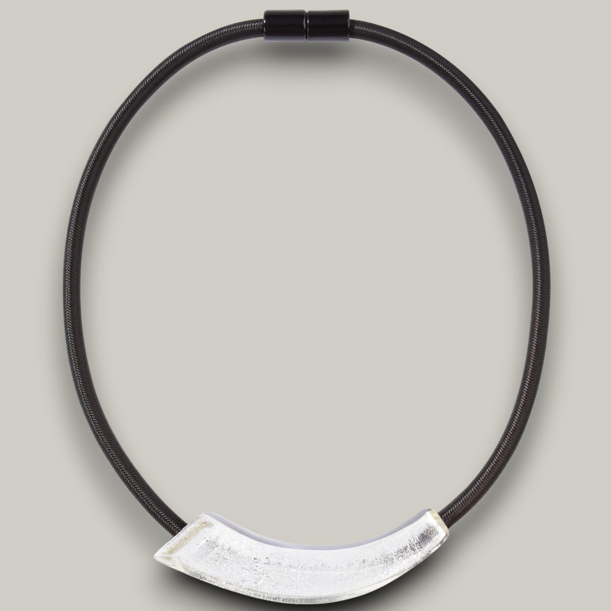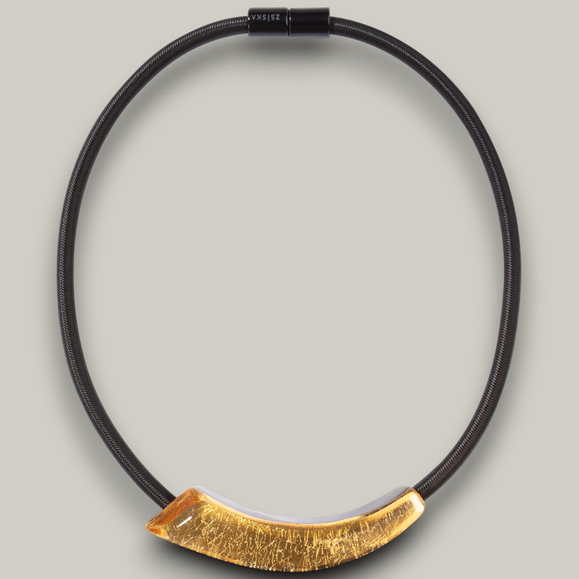 A modern take on wearable art, this necklace features a beautifully arched resin pendant suspended from a sleek black cord with magnetic closure. The sculptural design whispers sophistication while its surface catches light in all the right ways. Minimal, bold, and utterly unforgettable.